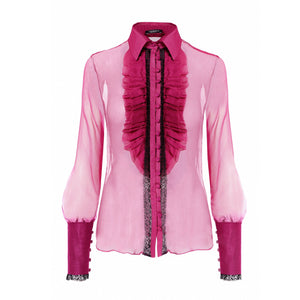 Perfect for transitional seasons, it drapes effortlessly over a nude or black bodysuit to highlight its sheer, ethereal quality. Wear it for polished office looks, evening gatherings, or layered for a weekend city escape. This Fuchsia Ruffle Silk Shirt is a versatile piece that transitions seamlessly from day to night. A limited edition design that embodies quiet luxury, independent craftsmanship, and modern femininity.