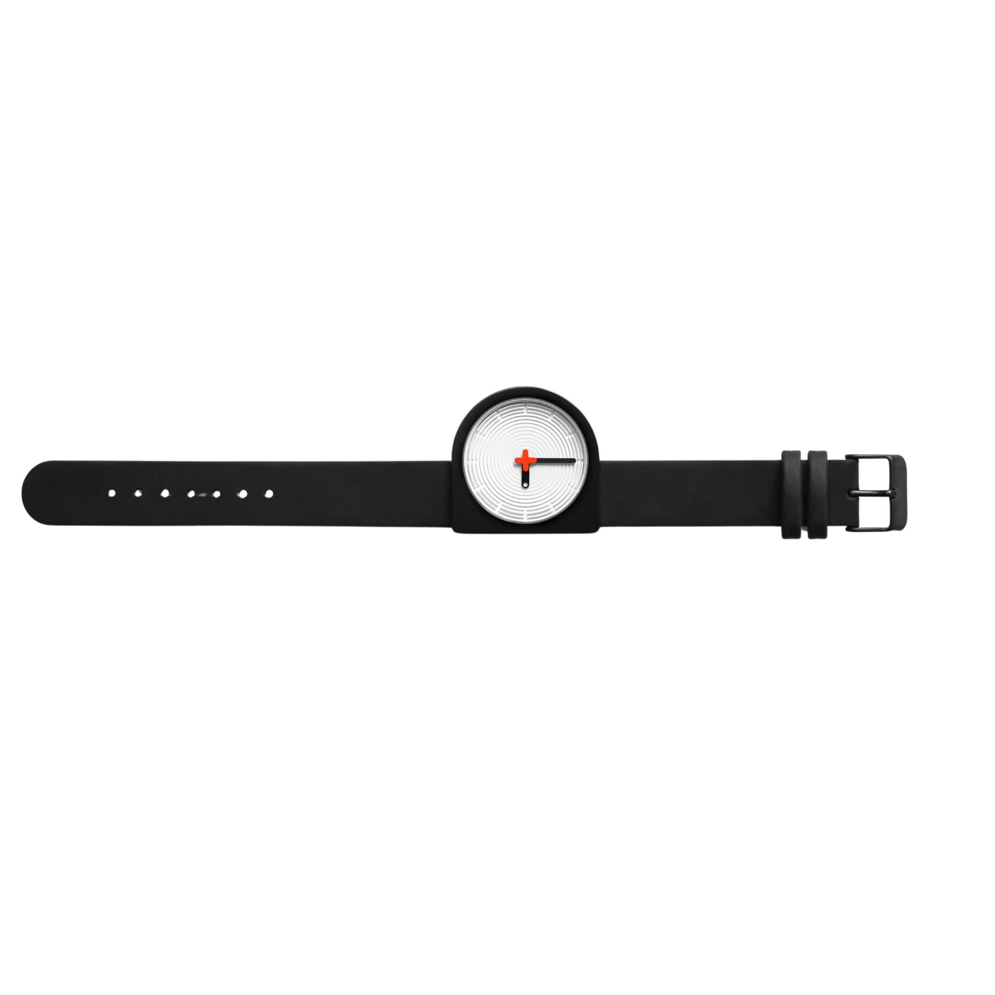 Strap: 18 mm black leather.Movement: Ronda Quartz.Functions: Hr, Min, Sec.Water Resist: 5atm / 50m.