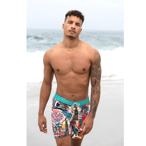 Channel laid-back island life with a bold conscience in these Island Print Board Shorts — a vibrant fusion of coastal color and eco-responsible design. Featuring a playful beach scene with surfers, palm trees, and ocean blues, this standout swimwear pairs retro flair with cutting-edge sustainability.