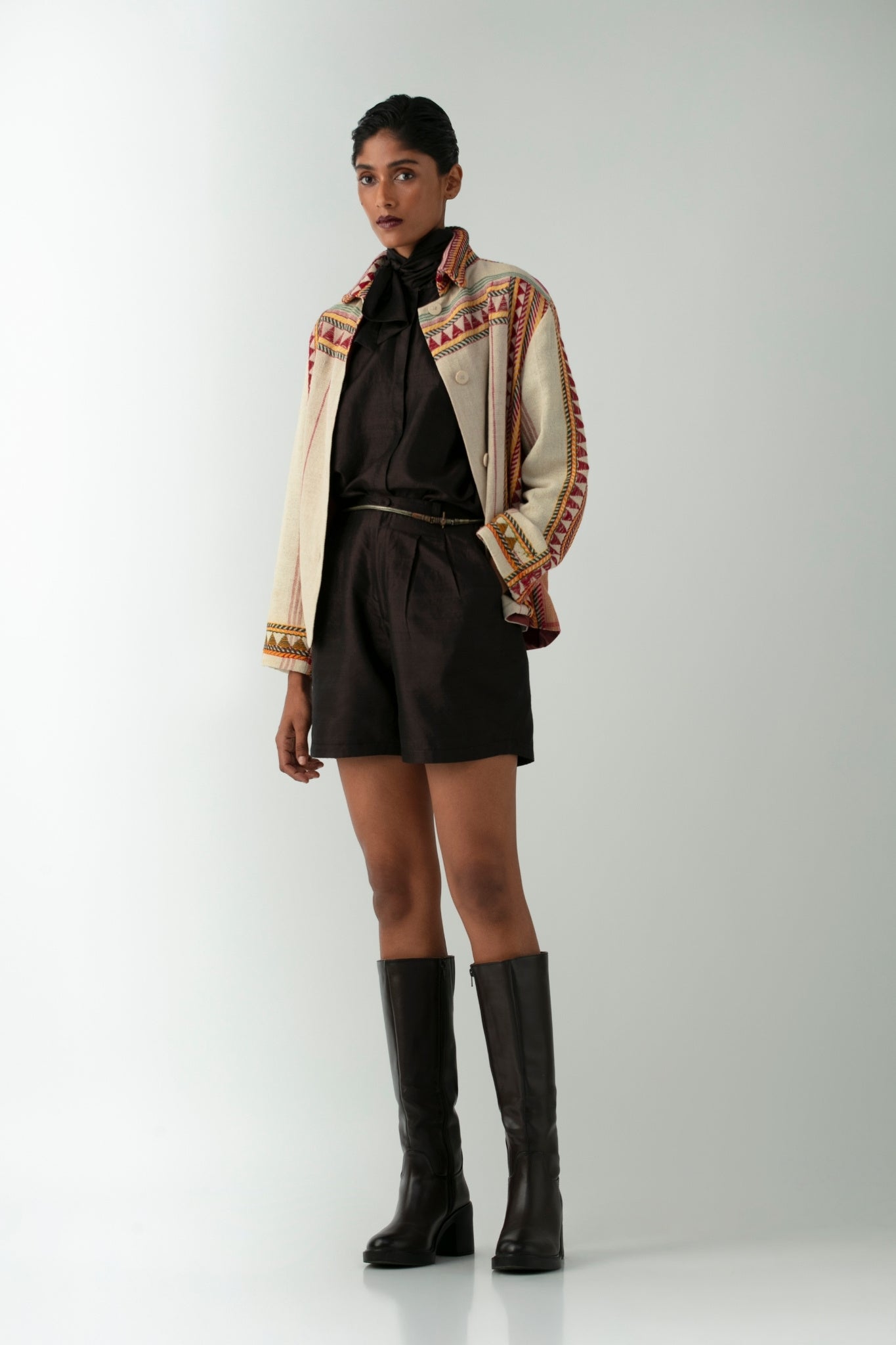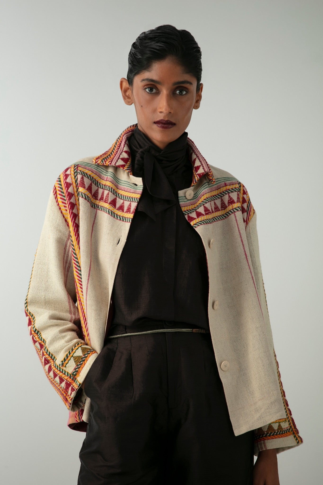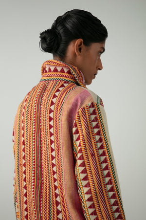 The oversized silhouette suits all genders, pairing bold cultural symbolism with contemporary ease. Earthy threads of crimson, turmeric, and forest green form a vibrant narrative on a raw, off-white base. Each piece is handmade and completely unique, rooted in the values of preservation, protection, and pride.