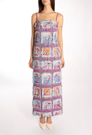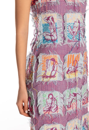 This long dress features vibrant multicolor artisanal embroidery that adds texture and personality to the silhouette.