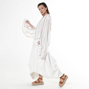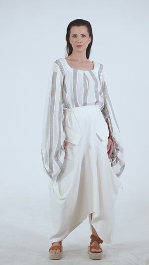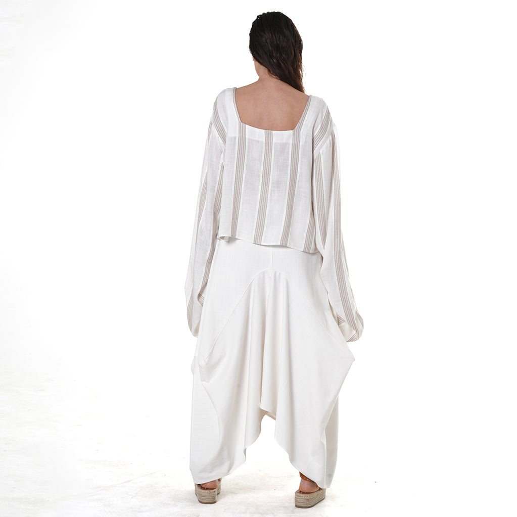 This modern cropped blouse features voluminous oversized sleeves with gathered cuffs and textured ivory-and-taupe stripes. Crafted from a breathable fabric blend, it delivers effortless elegance with a contemporary twist—perfect for elevated everyday styling.