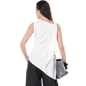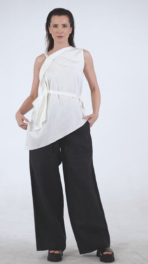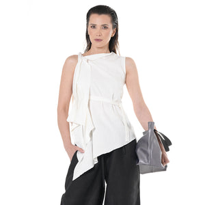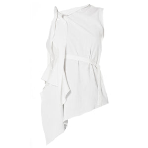 This lightweight blouse features an elegant asymmetric design with a delicate tie detail and a soft, wrinkled texture. In a tender ivory hue, the breathable fabric and adjustable waist tie offer comfort and shape—perfect for effortlessly refined, everyday looks.