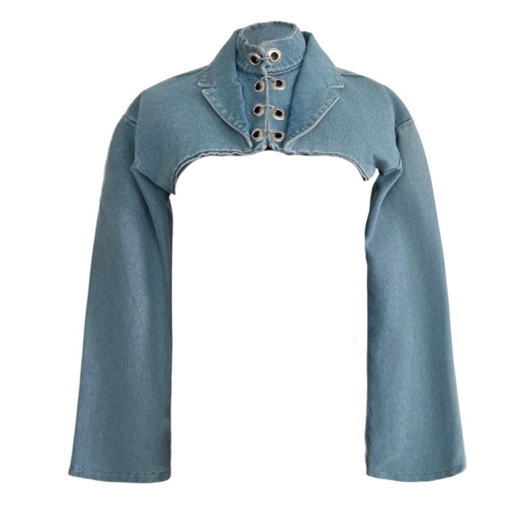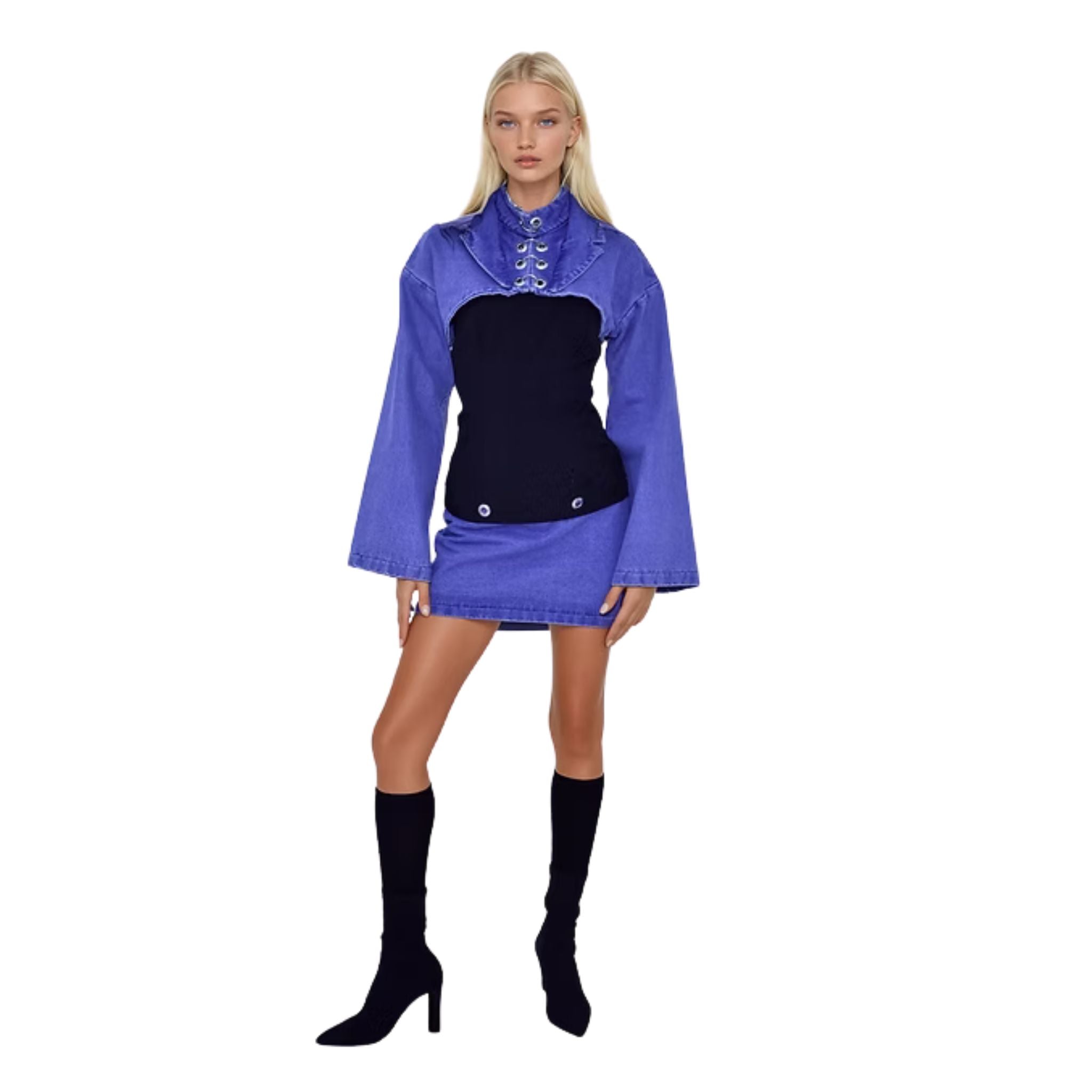 Elevate your wardrobe with the Mangas Exo Mezclilla — a striking piece crafted from 100% cotton in a denim gabardine finish, designed to make an impact. Featuring bold hardware detailing, this unique top combines rugged edge with refined simplicity for a standout look.