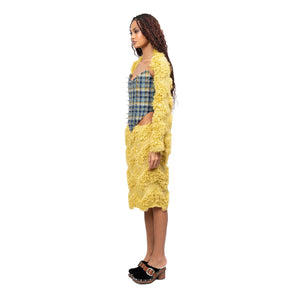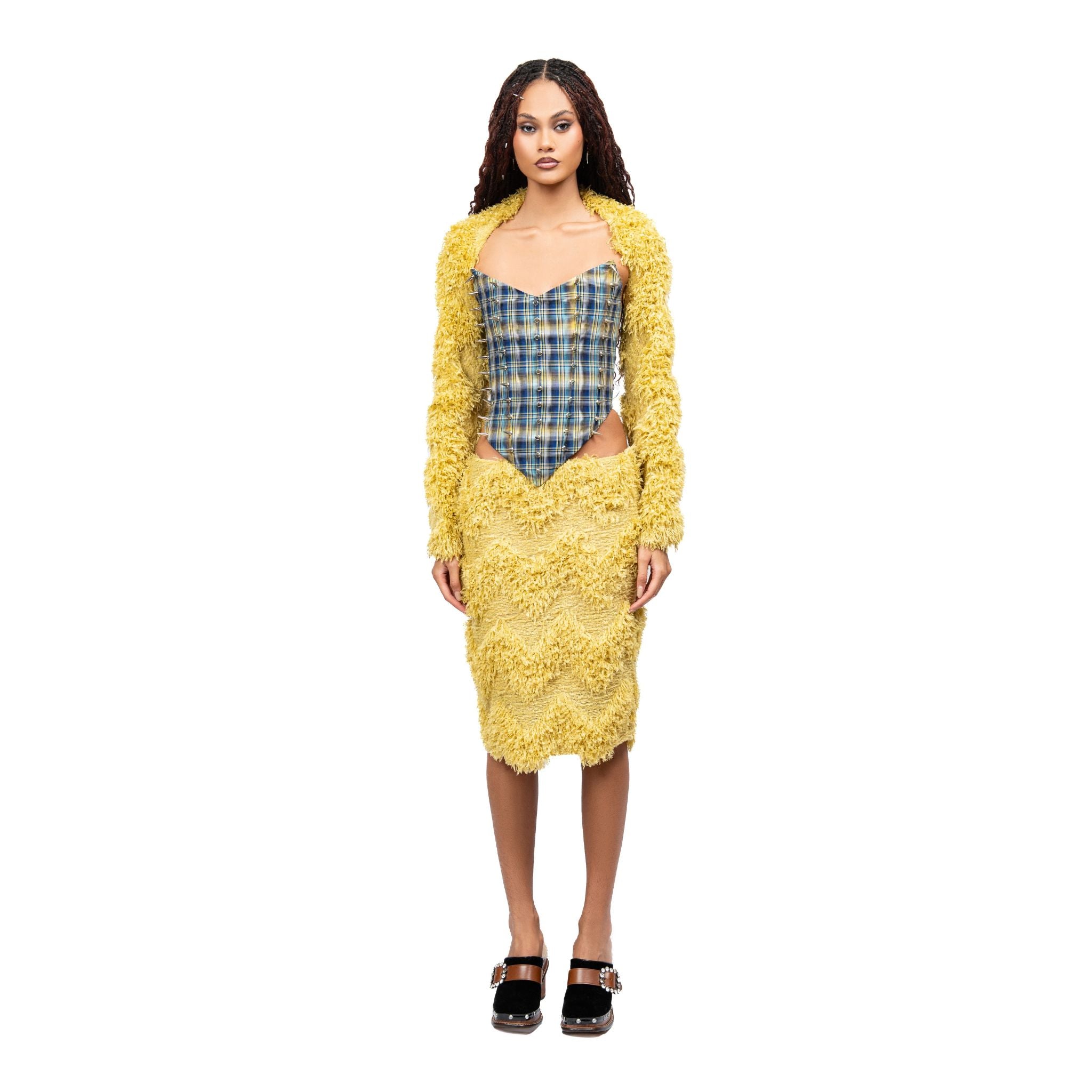 SELL WITH USA dramatic layering piece, this cropped bolero is made from matching mustard faux fur with soft sculptural volume. Designed to sit open over the shoulders, it adds bold texture and warmth to any look. Pair it with the coordinating Mustard Fur Midi Skirt for maximum impact. Handmade in Abu Dhabi by 28NATELIER in limited quantities.