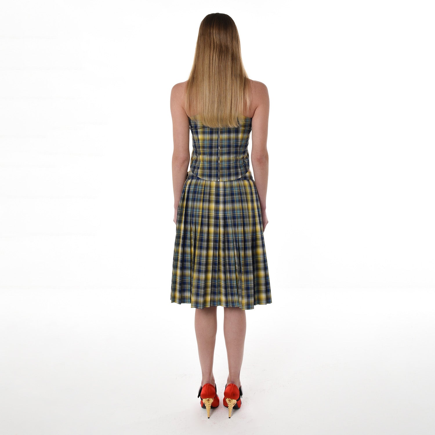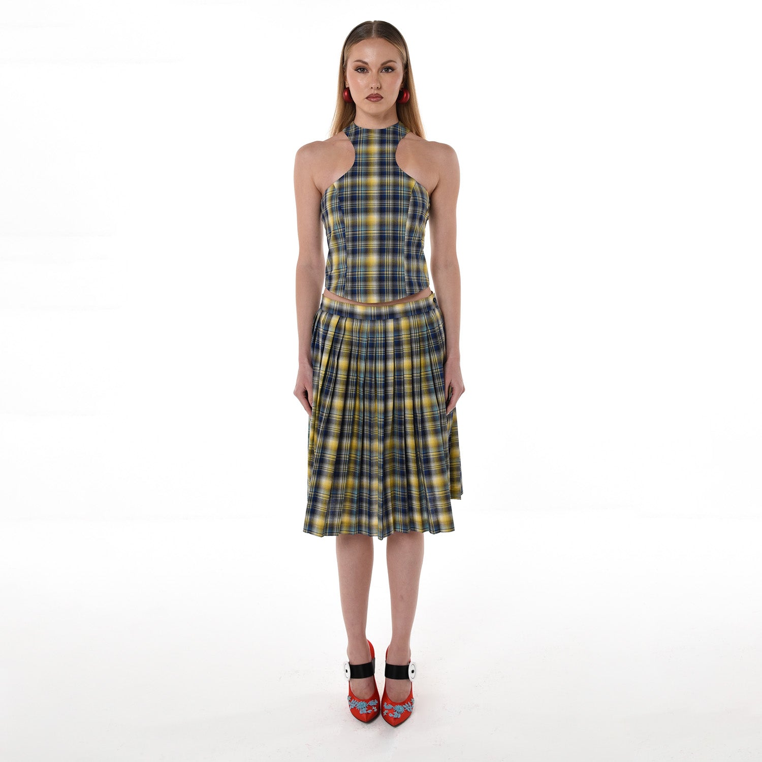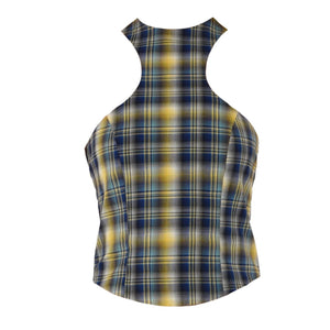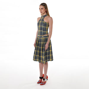 SELL WITH USThe Plaid Halter Top is a navy plaid halter neck crop top, handcrafted in Abu Dhabi by 28NATELIER and designed for those who appreciate structured silhouettes with a bold twist. Featuring a high neckline and a sharply tailored cut, this Plaid Halter Top accentuates the shoulders while offering a sleek, fitted shape through the bodice. The rich plaid pattern combines navy, yellow, and soft neutrals to create a contemporary yet classic color palette that effortlessly elevates any outfit. A discreet metal zip closure at the back adds a refined finish while keeping the silhouette clean and minimal from the front. Double lined for comfort, the top is cut to flatter and contour the body, making it ideal for both casual and elevated looks. Perfectly styled with the matching Plaid Pleated Skirt from 28NATELIER for a polished co-ord set, this halter top adds a confident edge to your wardrobe with timeless structure and fresh energy.