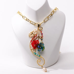 SELL WITH USThis necklace is a wearable sculpture of marine beauty. A graceful seahorse is the centerpiece, meticulously shaped from 18kt gold-plated wire. Its body is a mosaic of iridescence, made from repurposed fish scales, highlighting a commitment to using natural and recycled materials.