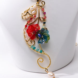 The chain itself is part of the design, featuring luminous freshwater pearls placed and pieces of shimmering mother-of-pearl that catch the light. The subtle texture of the scales showcases meticulous handiwork. This piece is more than a jewel; it's a statement of artistry, blending skilled craftsmanship with a story of environmental sustainability.