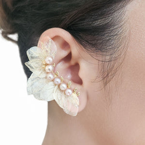 This earcuff is a harmonious blend of a delicate sea lily's stem in an enchanting shape over a plated 18kt gold base. It's expertly adorned with sparkling crystals and lustrous pearls that flow along its unique silhouette, catching the light beautifully.