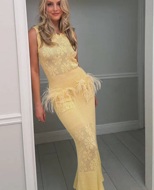 Butter Yellow Knit Dress With Feathers dress is designed with round neck perfect fits on the body and create fabulous feminine look. Perfect with sandals, heels and sneaker for any occasion, day or night.