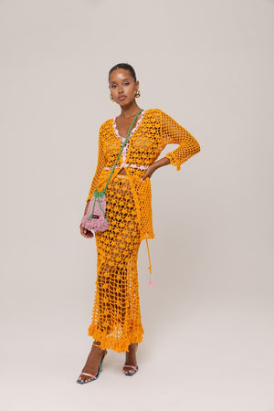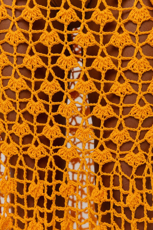 The midi silhouette is high-waisted and body-hugging through the hips before cascading into a looser weave that moves effortlessly with you. Finished with delicate tassels and a subtle tie at the waist, it's both flattering and breathable — ideal for styling over swimwear or coordinating with the matching California Poppy Crochet Shirt.