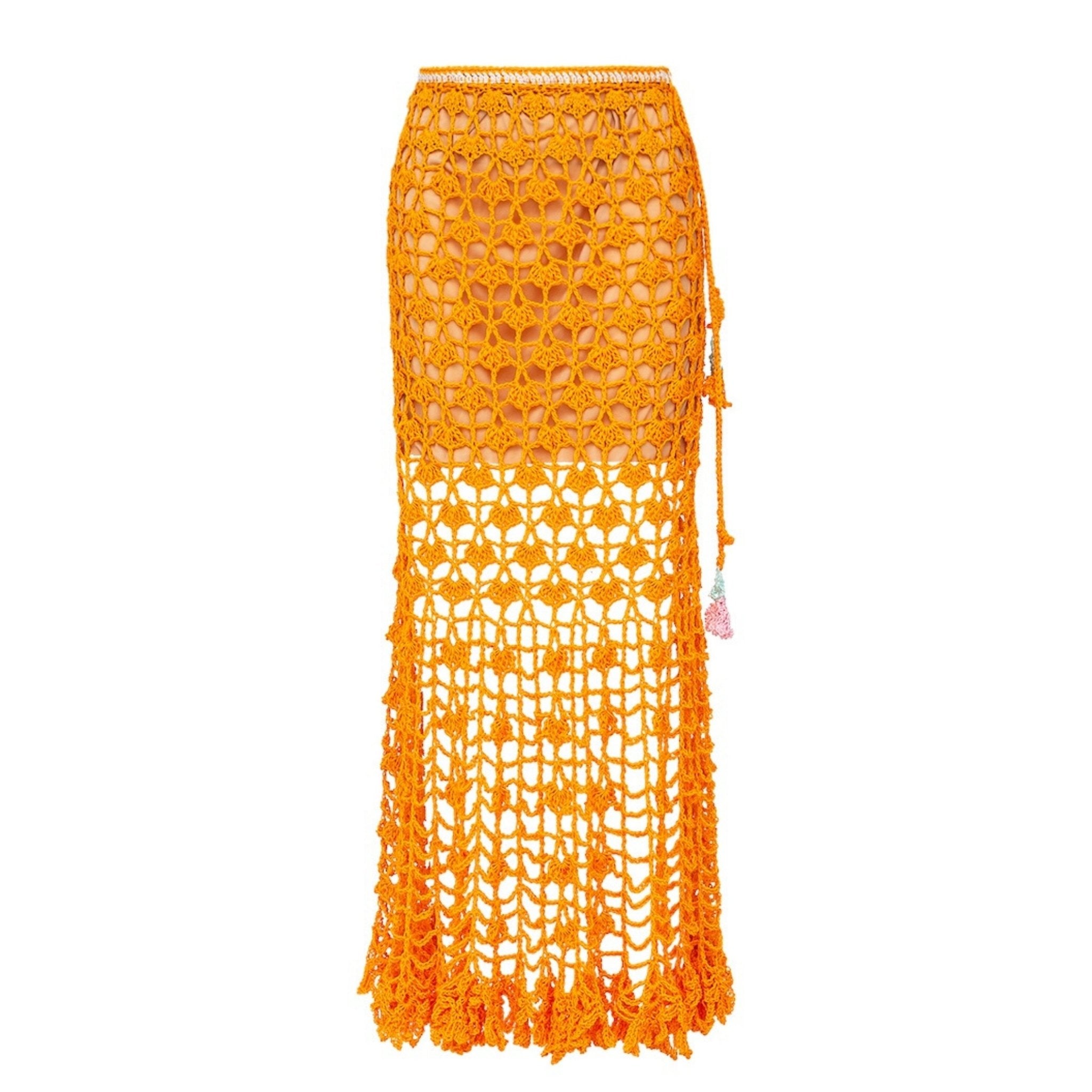 Make a bold, sun-drenched statement in the California Poppy Orange Handmade Crochet Midi Skirt by ANDREEVA. This artisanal piece is hand-crocheted from a cotton-viscose blend, offering a vibrant open-knit design that celebrates craftsmanship and carefree elegance.
