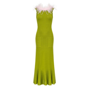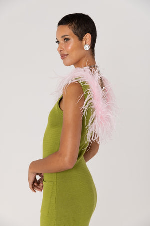 Real pink ostrich feathers at the hem lend movement and couture-level detail, creating a tactile contrast against the vibrant green base. Designed to transition from day to night, it pairs effortlessly with everything from crisp sneakers to strappy heels.