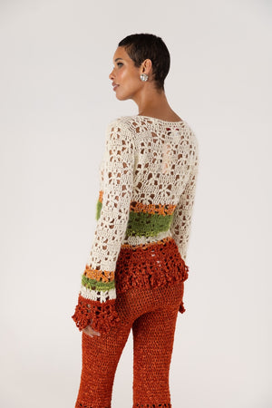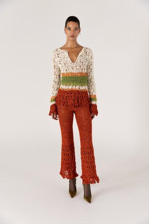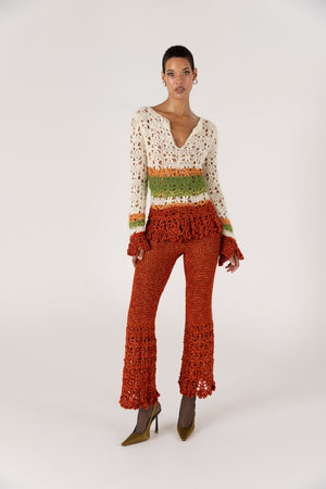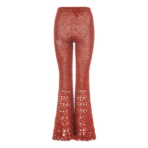 SELL WITH USAn ode to earthy elegance, the Chrysanthemum Terracotta Handmade Crochet Pants by ANDREEVA are a bold, bohemian staple crafted entirely by hand. Cut in a flattering high-waisted silhouette, these pants skim the hips and thighs before flaring into a wide leg with intricate open-knit detailing and scalloped hems that move with fluid ease.