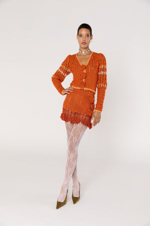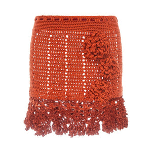 SELL WITH USDesigned to flatter and crafted to charm, the Chrysanthemum Terracotta Handmade Crochet Mini Skirt by ANDREEVA showcases exquisite hand-knitting in a rich autumnal tone. Made from a cozy yet breathable blend of viscose and cashmere, this fitted silhouette hugs the waist and hips before finishing with a hand-crocheted floral hem for added texture and drama.