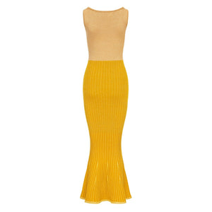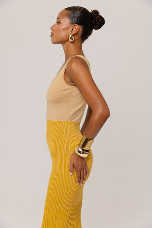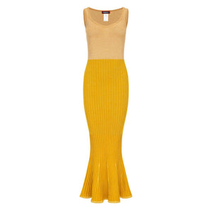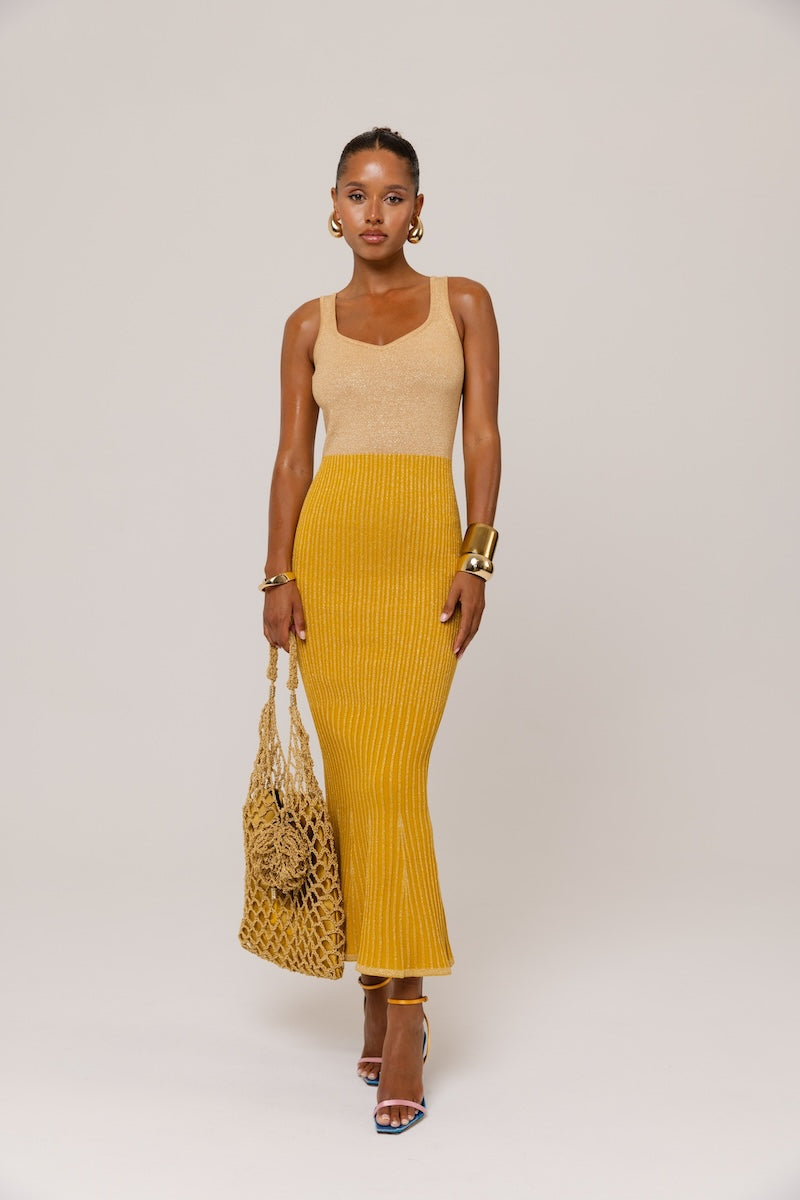 Radiate from dusk to dawn in the Golden Hour Metallic Knit Dress by ANDREEVA, a luminous wardrobe staple designed for standout summer nights and golden moments. Knitted from a luxe viscose-blend metallic yarn, this dress hugs the body through the bodice and hips before flaring into a gently rippled hem — creating a silhouette that moves as effortlessly as you do.