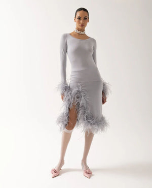 Grey Knit Skirt With Feather Details is cut from lightweight high quality knit with a hint of stretch. The skirt has ruffled feather trim. Style the skirt with gray knit top with detachable feather cuffs and a pair of mules or heels.
