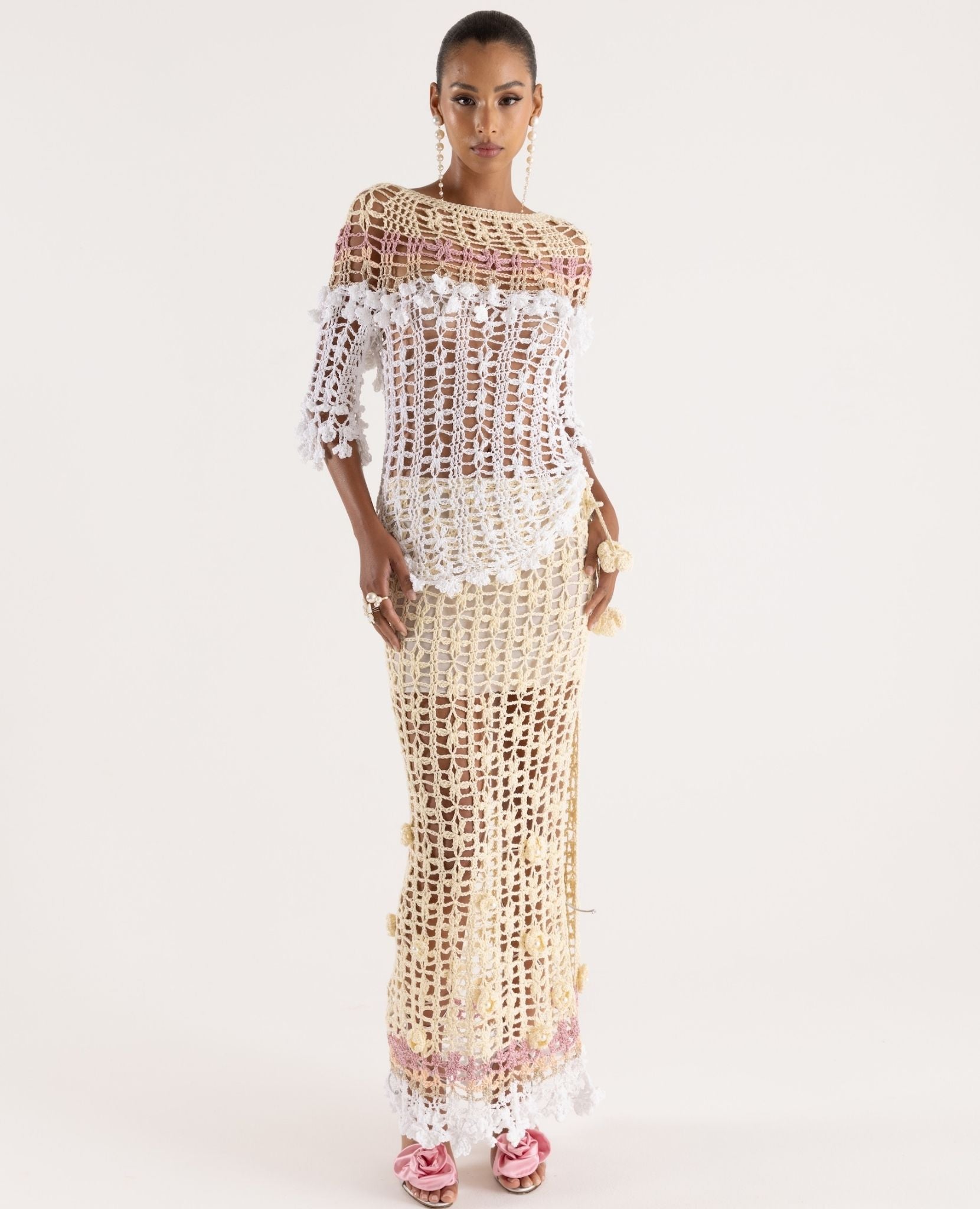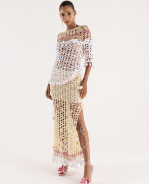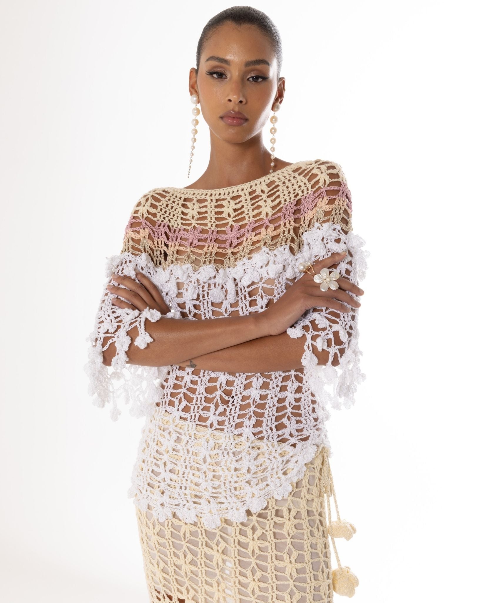 SELL WITH USHandmade with care, this multicolor crochet top showcases an open-knit design with intricate hand-crocheted flowers. Its fitted silhouette pairs perfectly with matching crochet skirts or pants for a standout look.