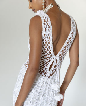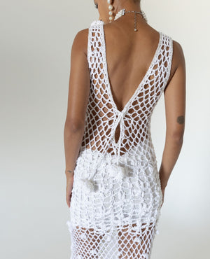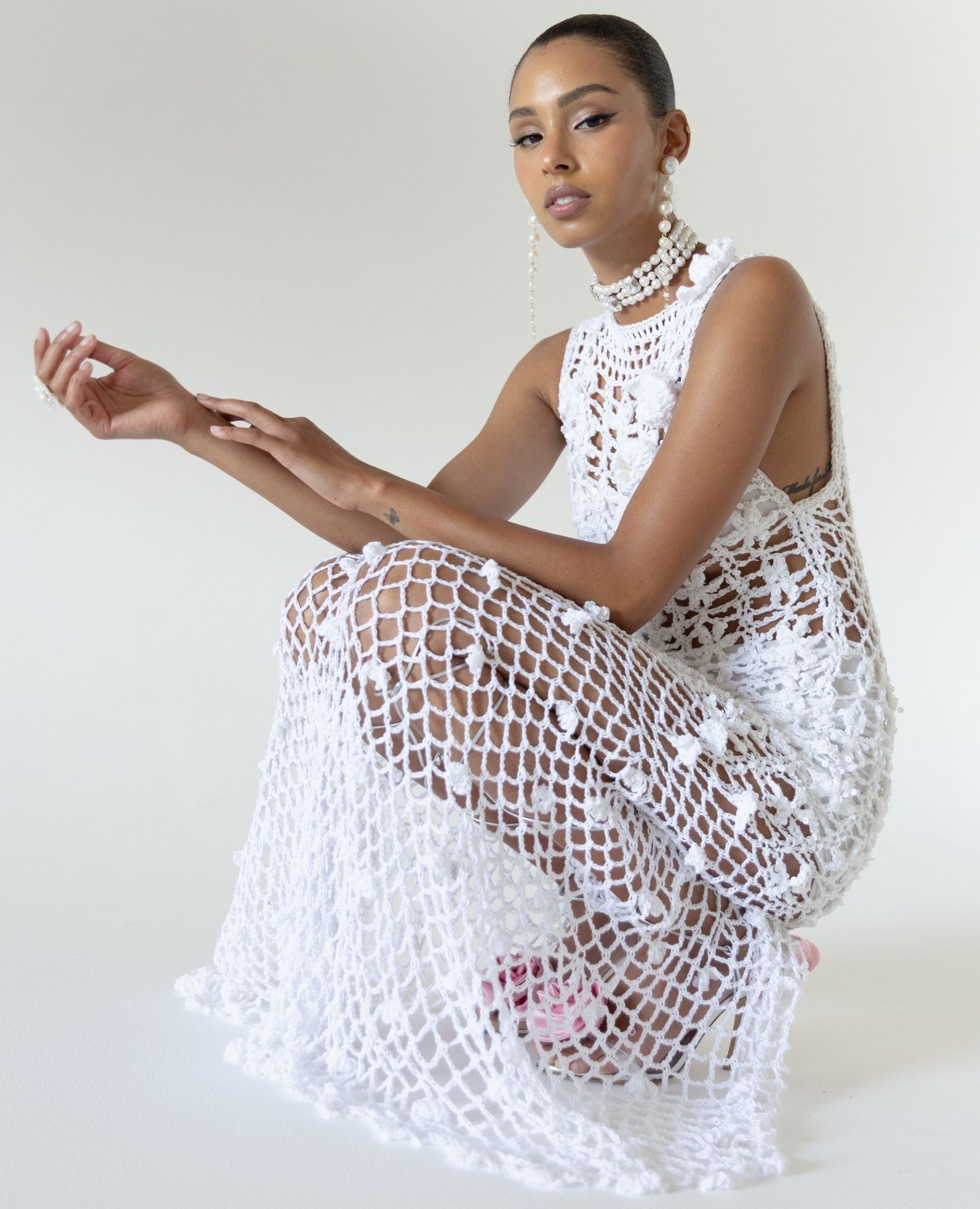The White Vanilla Handmade Maxi Crochet Dress exudes elegance with its handmade knit details, delicate pearl accents, open back, and round neckline. Perfect for special occasions.