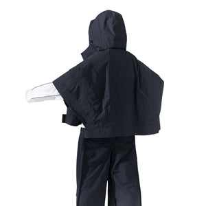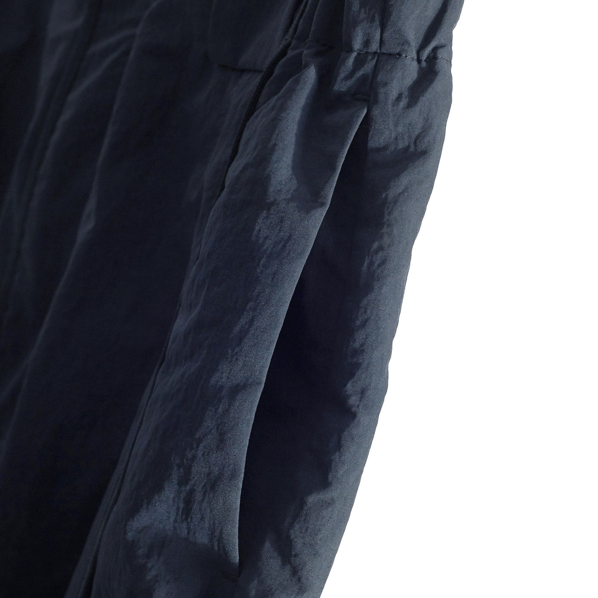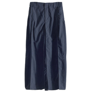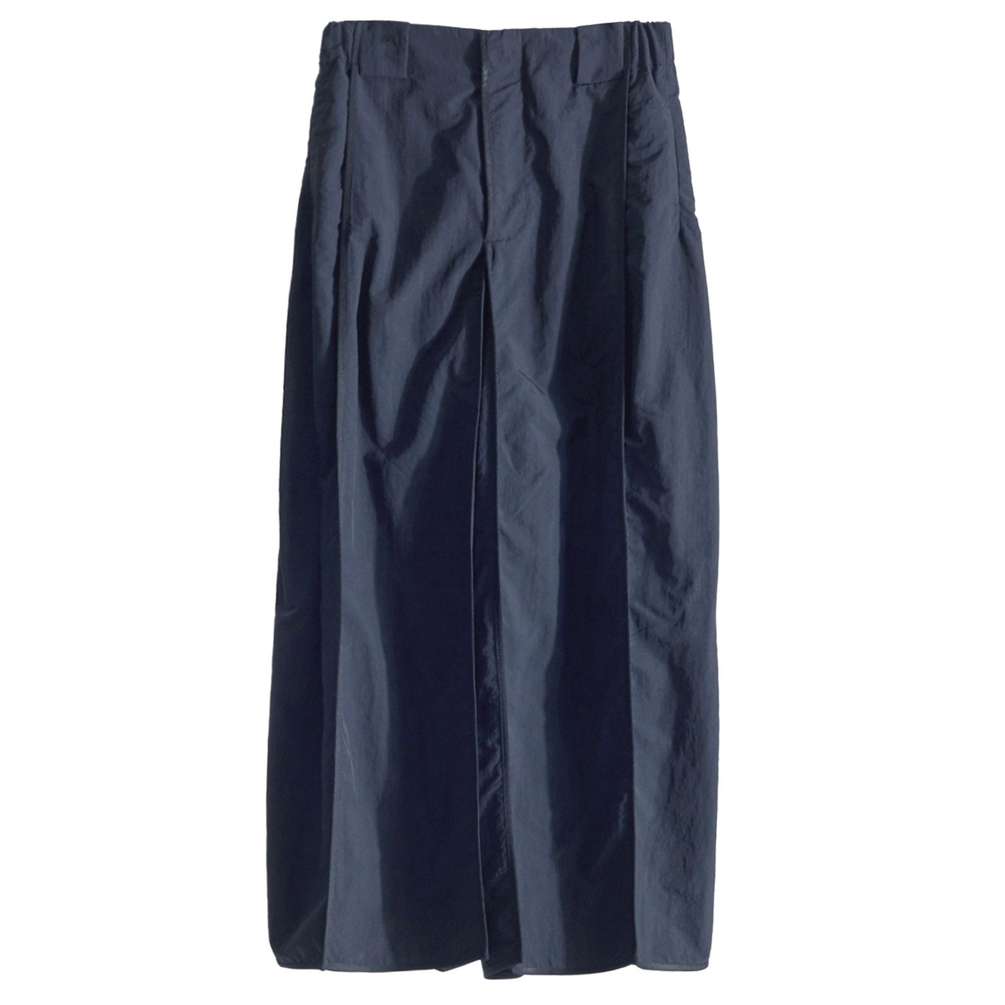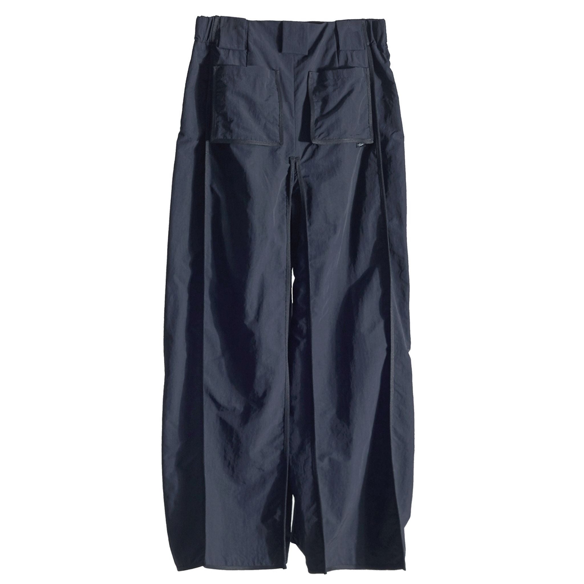 Wide pants constructed with angular panels and exterior hinge details wrapping the corners, finished with exposed, externally bound seams. Made from lightweight, soft nylon, the straight-falling elongated rectangular silhouette delivers both a structural presence and comfortable wear, with its construction naturally revealed through movement. Smoothly flowing angular panels that create a soft silhouette with movement.