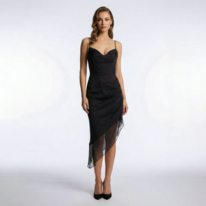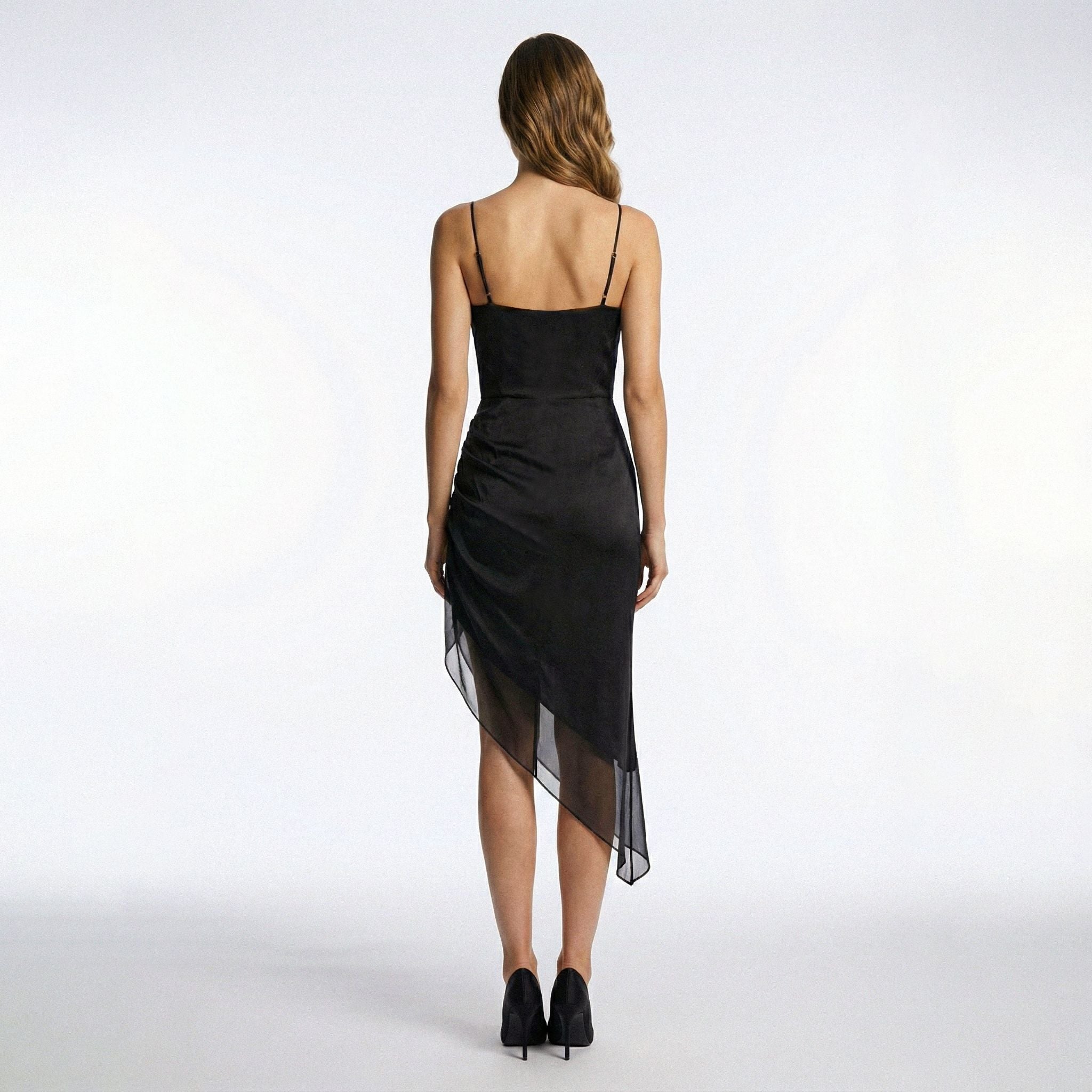 Elegant, refined, and effortlessly versatile, this Black Asymmetric Silk Midi Dress by AVENUE No.29 combines luxurious silk with modern design details. Crafted in the EU by an independent atelier, it features adjustable delicate straps, subtle side gathering, and an asymmetric slip-style silhouette that flatters the waist and elongates the figure.