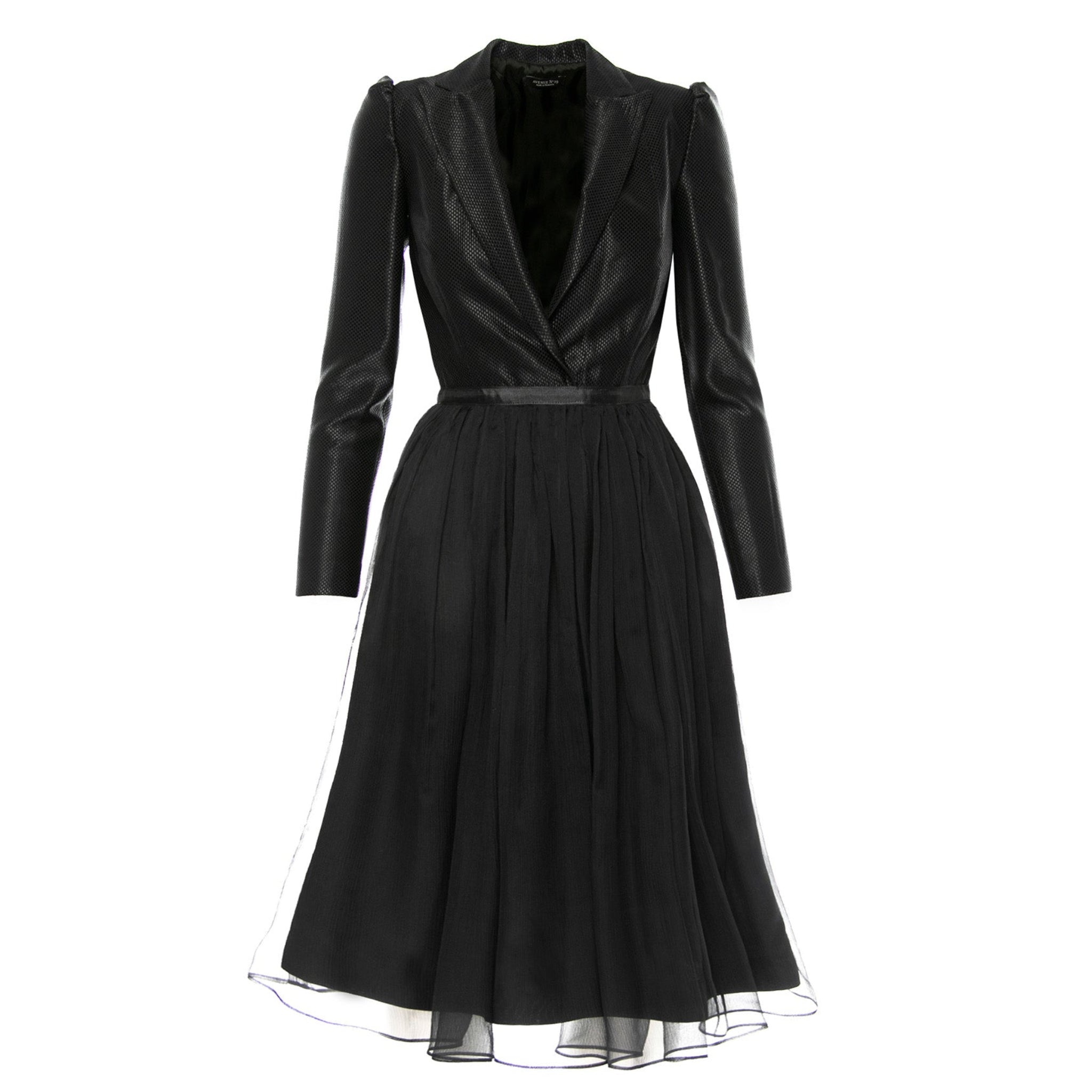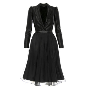 Sophisticated and versatile, this Black Midi Dress with Blazer Silhouette by AVENUE No.29 combines the structured elegance of a tailored blazer with the soft, flowing grace of a gathered skirt. Crafted from luxurious silk voile and viscose, it features a deep V neckline, sharp lapel, and long sleeves that emphasize the waist and create a refined silhouette.