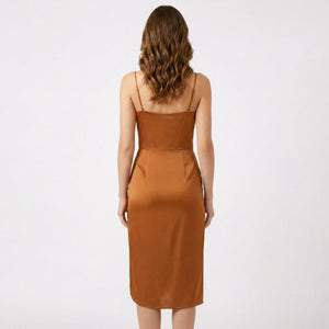 Sophisticated, elegant, and effortlessly versatile, this Brown Midi Slip Dress by AVENUE No.29 combines minimalist design with refined detailing. Crafted from 100% viscose with a lightweight satin texture, it offers a subtle sheen and exceptional comfort.