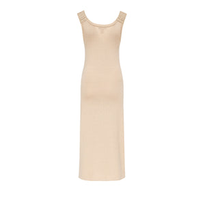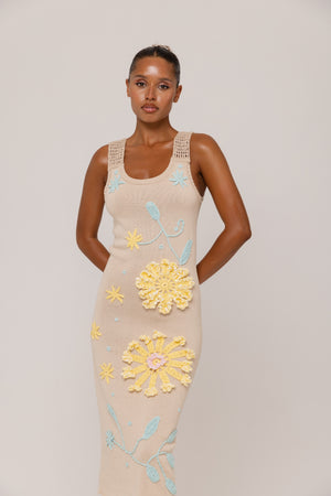 ANDREEVA - Beige Knit Midi Dress with Yellow & Blue Floral Embroidery | DOORS NYC