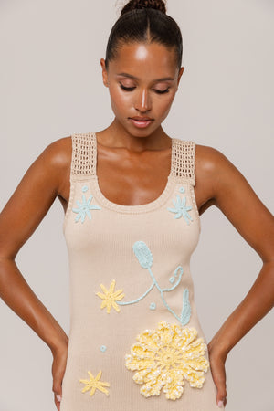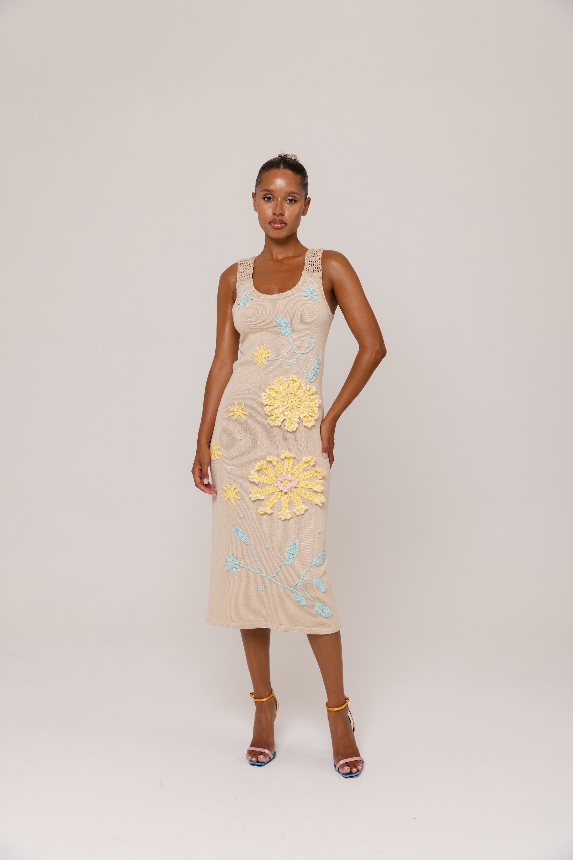 Beige Knit Midi Dress with Yellow & Blue Floral Embroidery