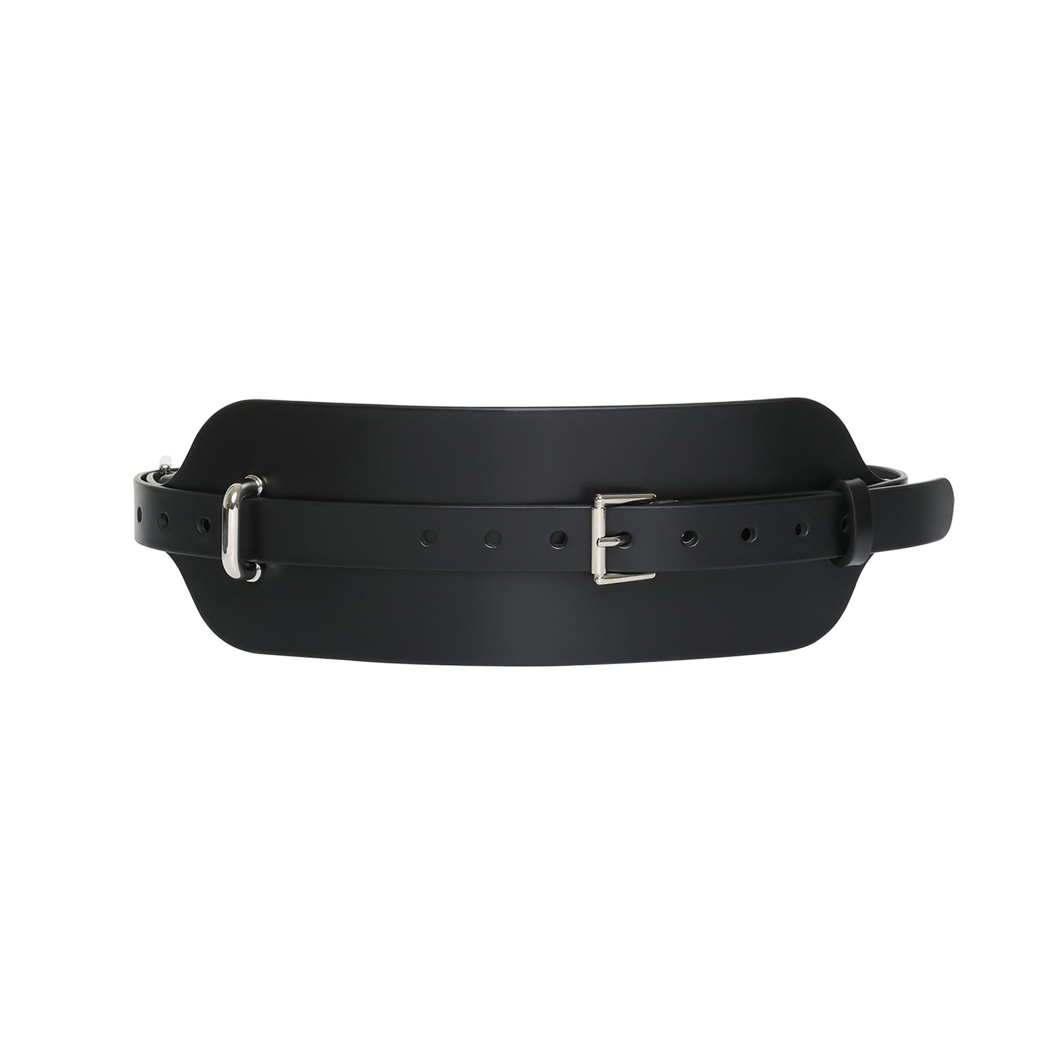 The Calen Waist Leather Belt is a statement piece crafted from smooth, structured leather with a bold, architectural silhouette. Featuring an 8 cm wide front panel cinched on the waist by the 2 cm slim strap, the belt adjusts using the dual buckle closure.
