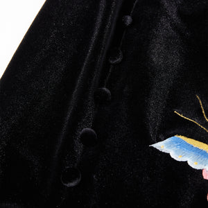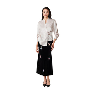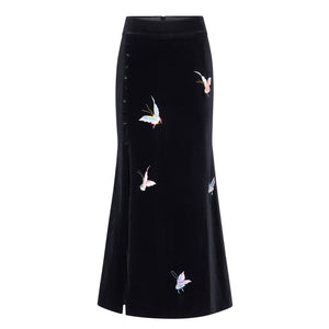 Black velvet fishtail midi skirt with multi-colored butterfly embroidery and front-side slit. In Chinese culture, the butterfly is cherished as an emblem of love and good fortune. Tailor-made by artisans in Wenzhou, China.
