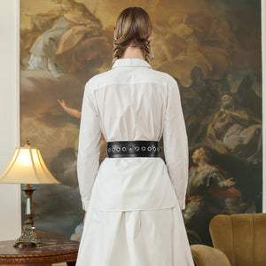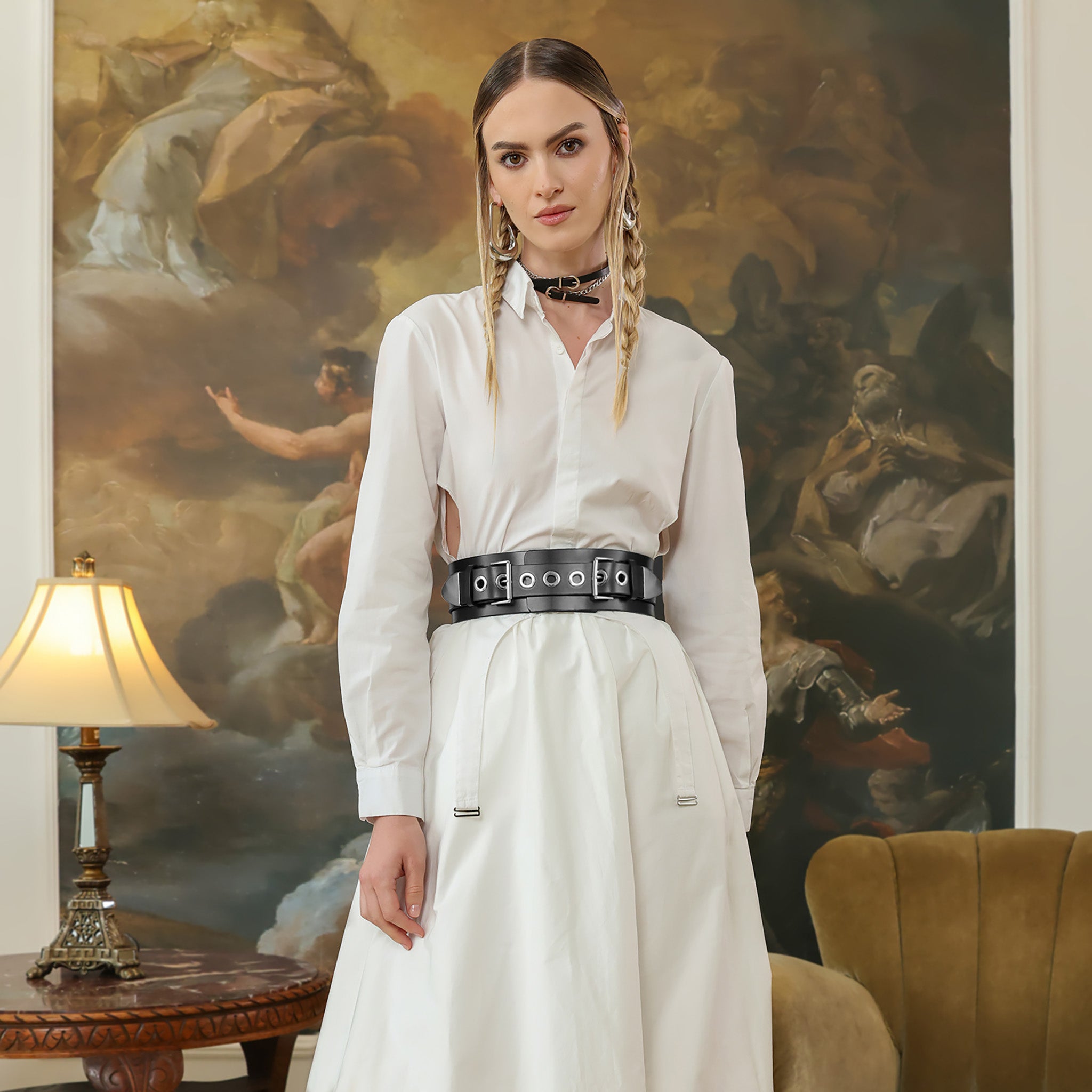 The polished hardware amplifies its striking appeal, while sturdy dual buckles ensure a secure, adjustable fit. A powerful accessory, the Eyeleted Belt highlights the silhouette with strength and refinement, perfect over dresses, blazers, or layered looks.