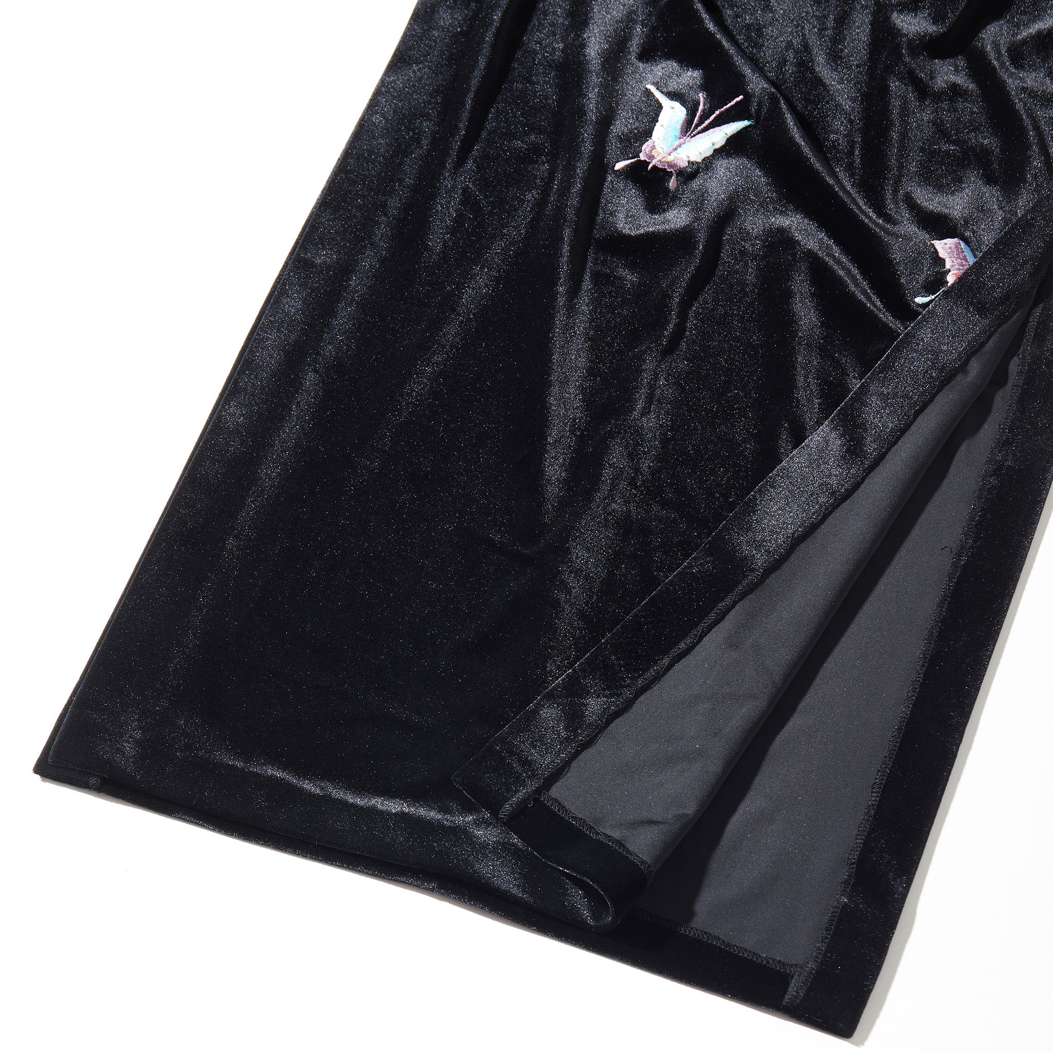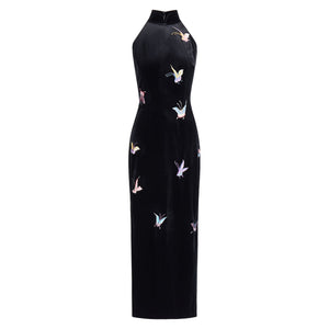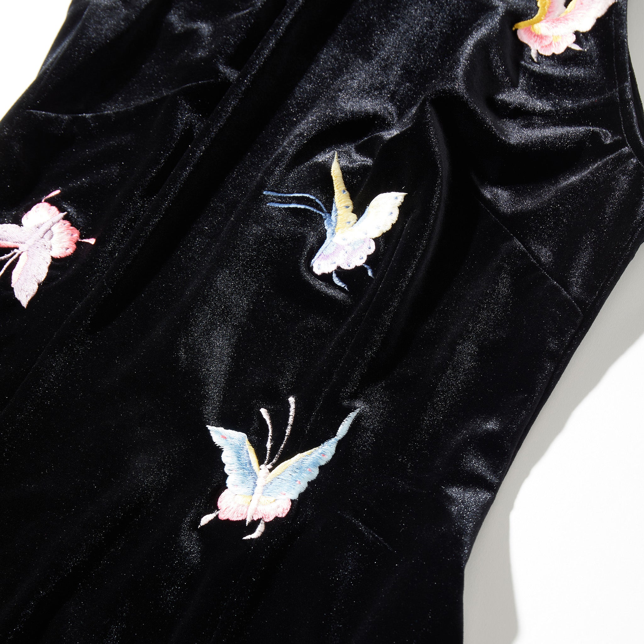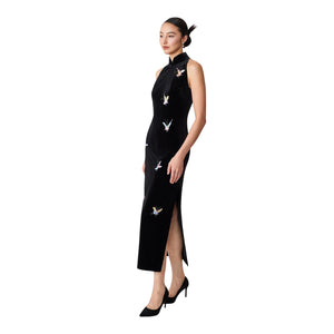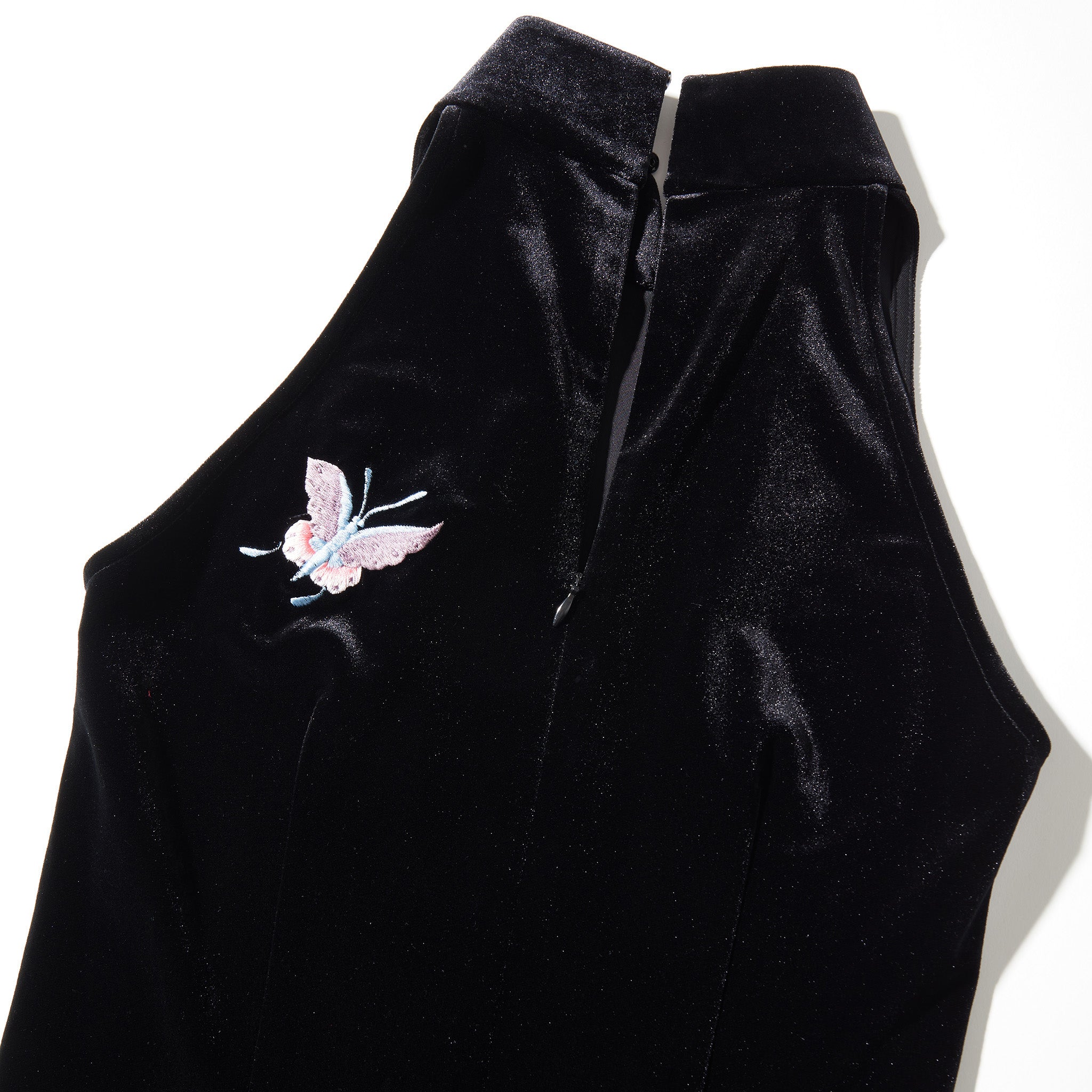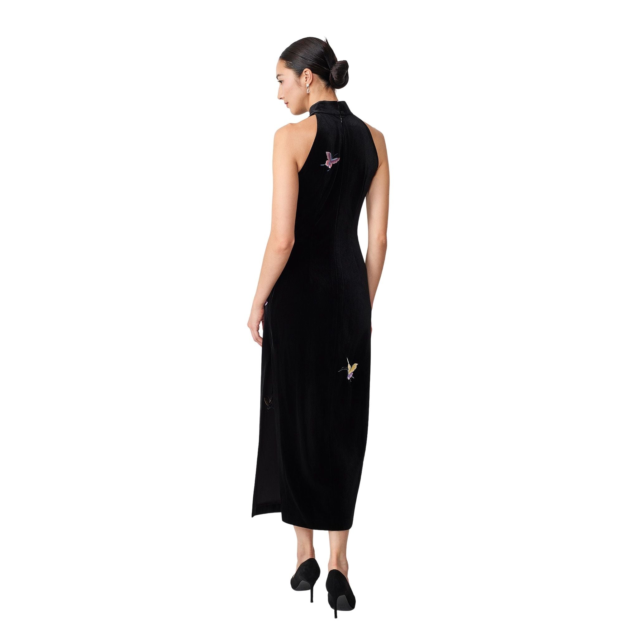A sculptural halter-neck qipao in black elastic velvet, designed to skim the body in a sleek, elongated line. Multicolor butterfly embroidery animates both the front and back, while the pared-back rear keeps the finish modern and refined. A side slit brings fluid movement and comfort. In Chinese culture, the butterfly is cherished as an emblem of love and good fortune.