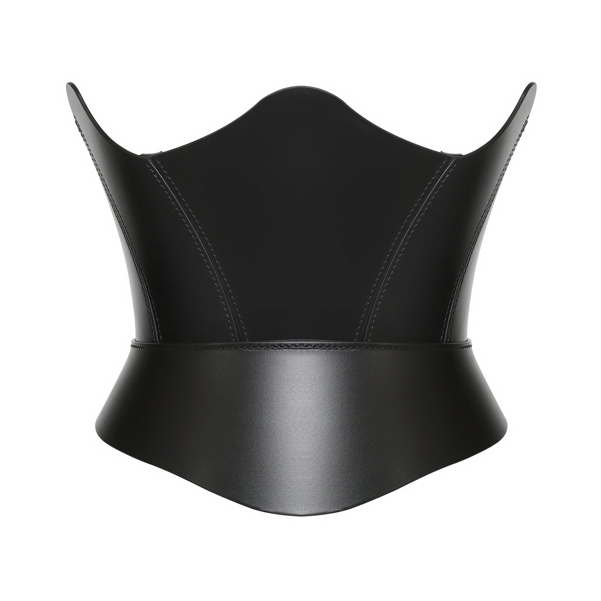 Crafted from supple black leather, the Juno Corset blends bold lines with graceful curves. Its sculptural underbust corset gives way to a flare peplum that genlty angles outward, forming a dramatic silhouette that enhances movement and presence.