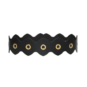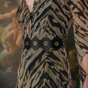 The Lume Waist Belt stands out with its sculptural, wave-like contour and gleaming grommet detailing. Crafted from smooth premium leather, its flowing shape wraps the waist in a seamless line, creating a dynamic interplay of form and texture.