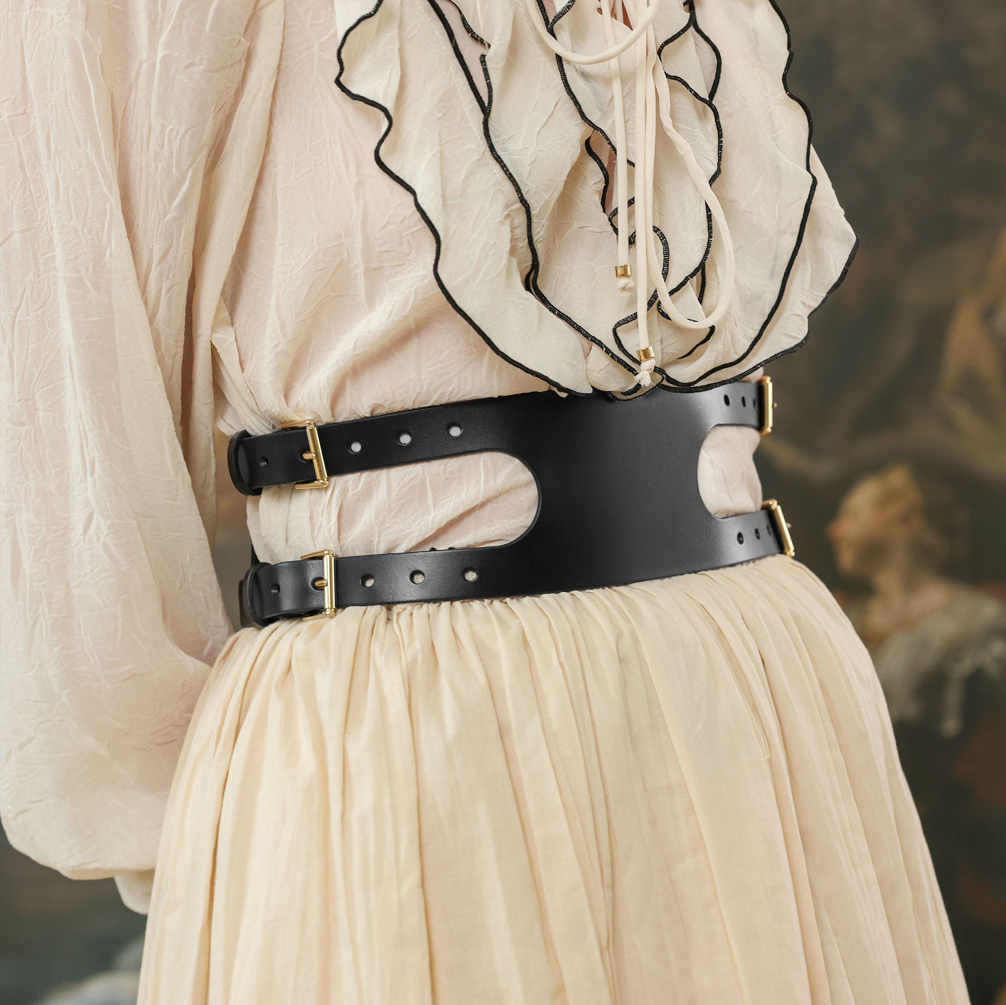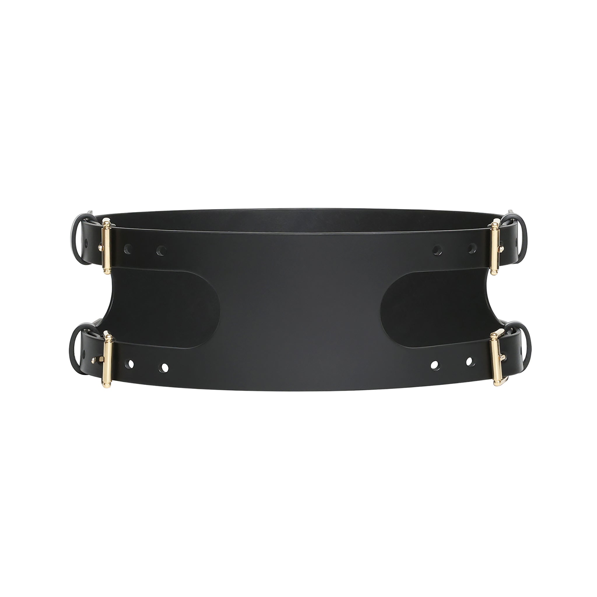 The Orin Wide Leather Belt makes a bold statement with its sculpted shape and striking lateral cut-outs. Its wide profile defines the waist, while double side buckles add both adjustability and balance.