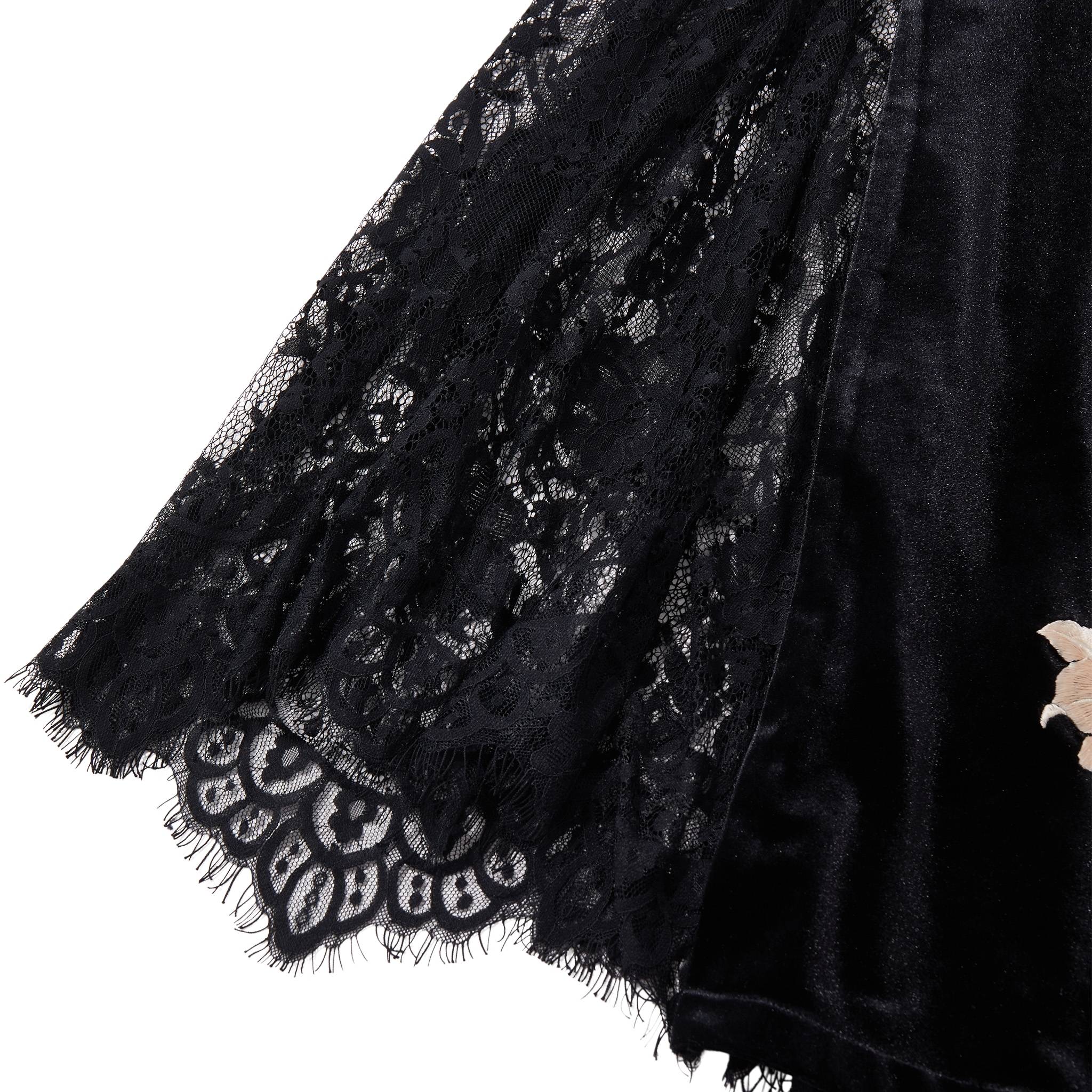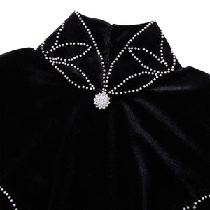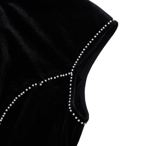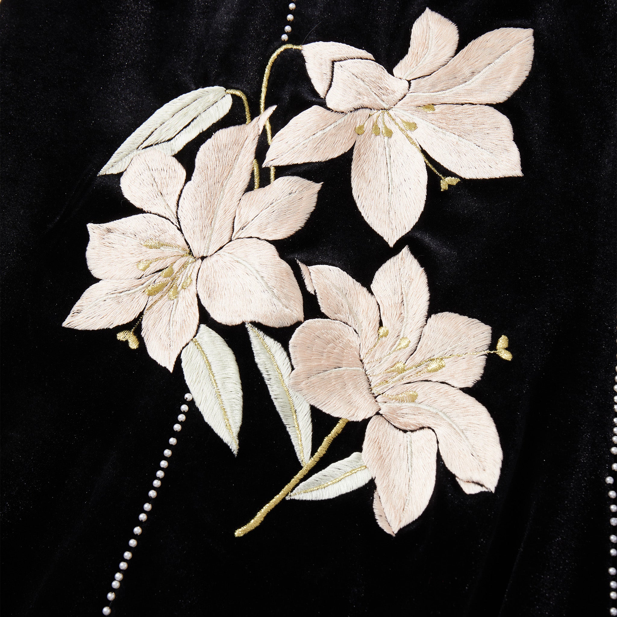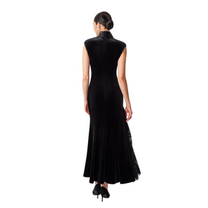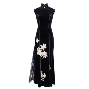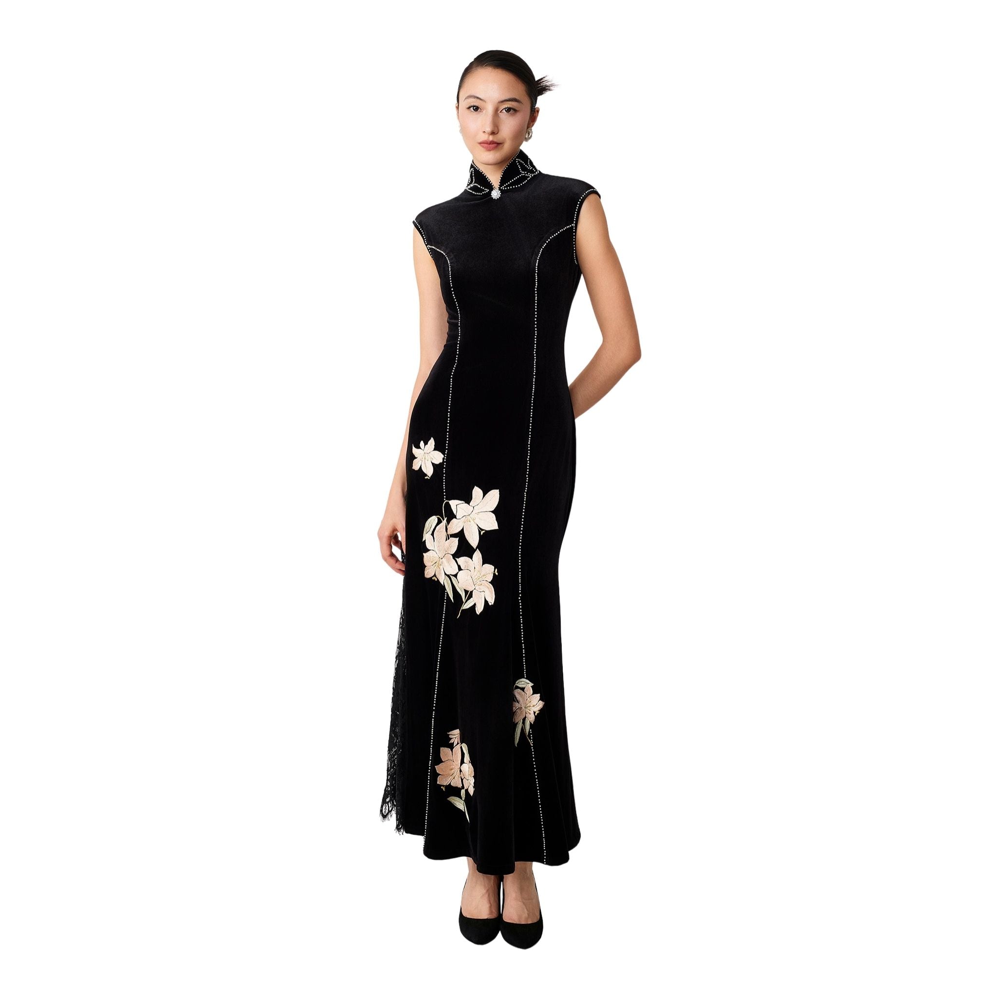 A floor-length mermaid qipao in plush black velvet, sculpted through the bodice before flaring to a sweeping hem. Shell cap sleeves and a high mandarin collar create a sharp, architectural frame, traced with delicate pearl-like beading that highlights the lines of the body. Floral lily embroidery blooms across the skirt in soft ivory tones with muted green leaves, while a sheer black lace godet panel adds movement and a subtle flash of texture with every step.