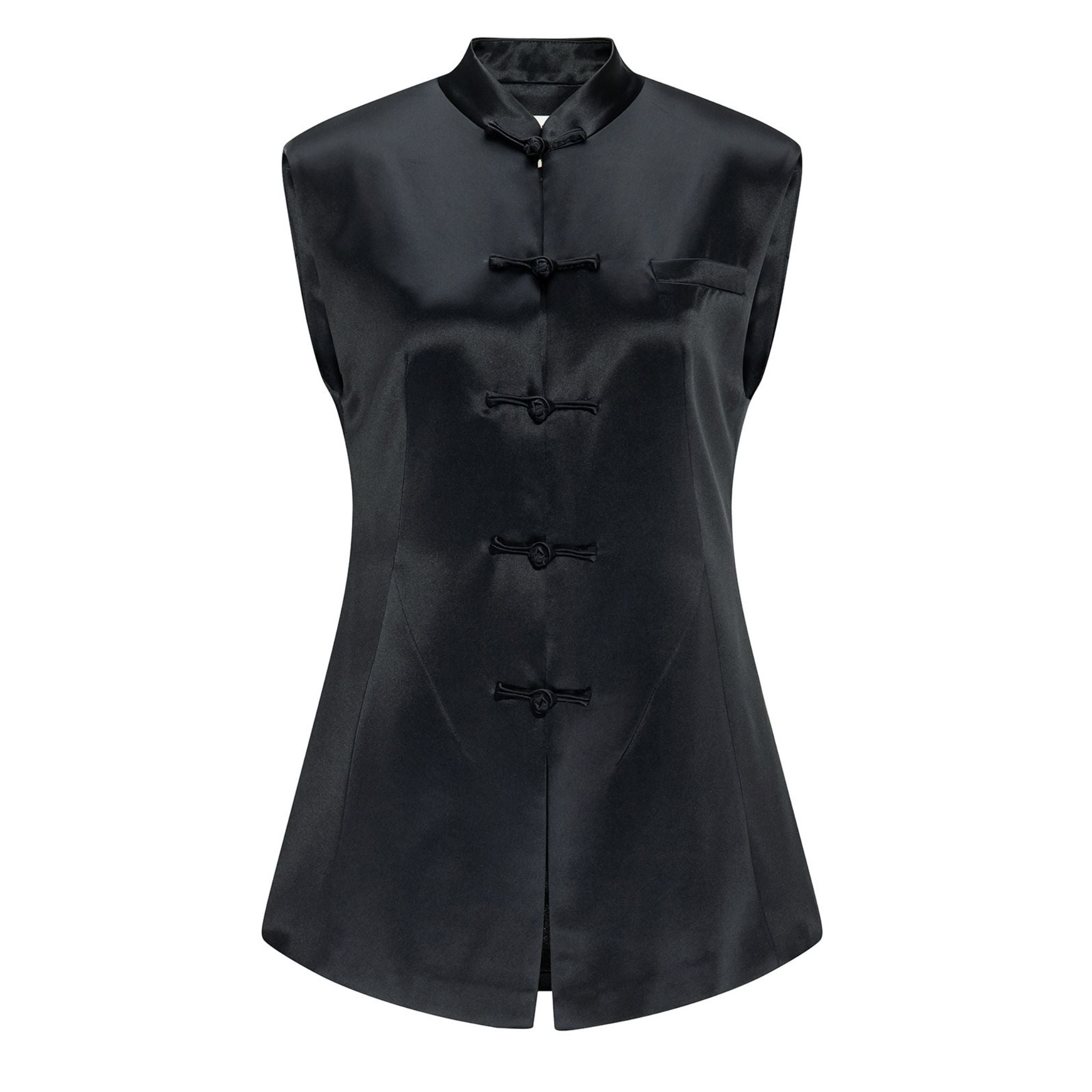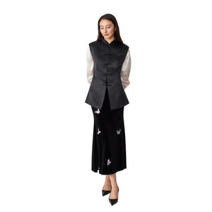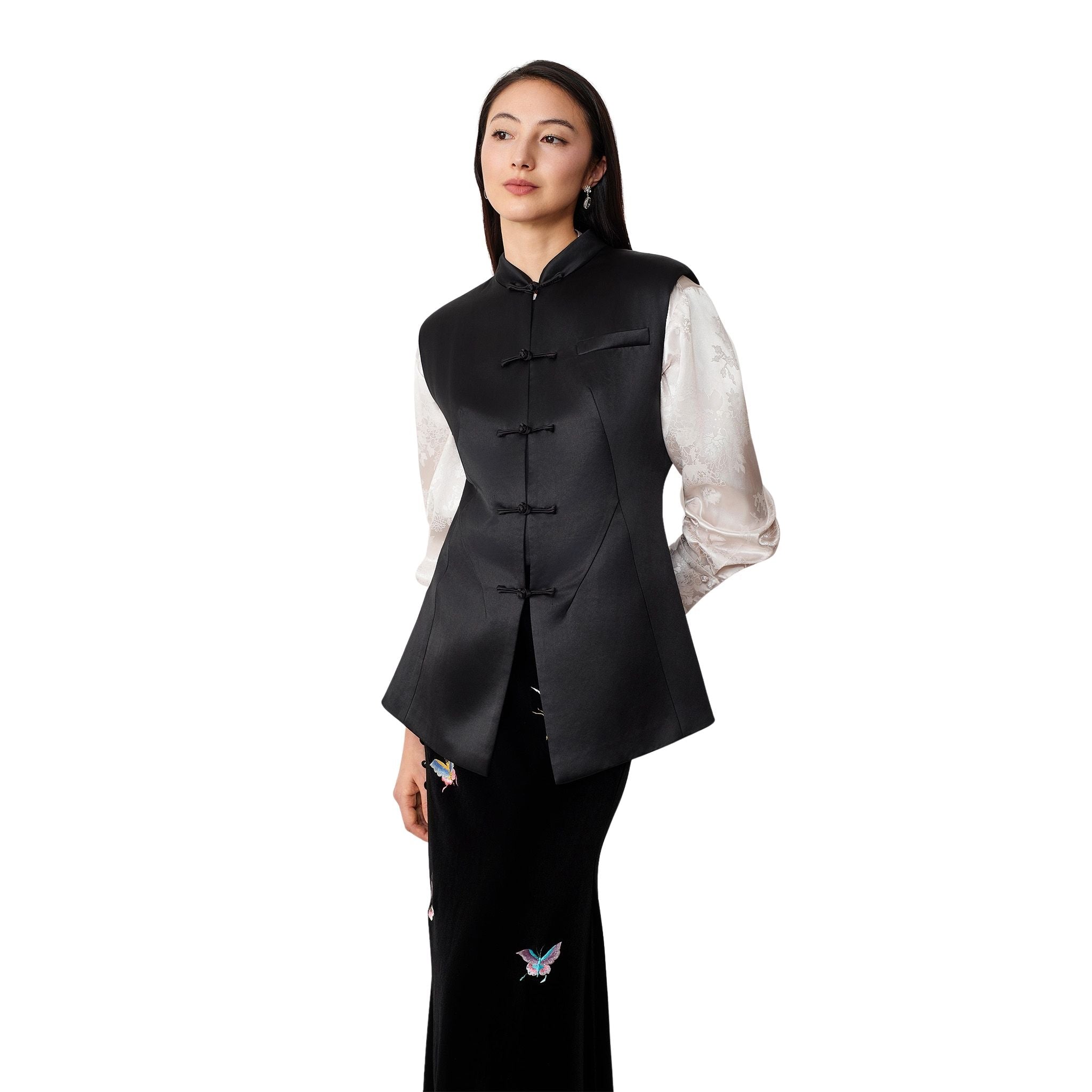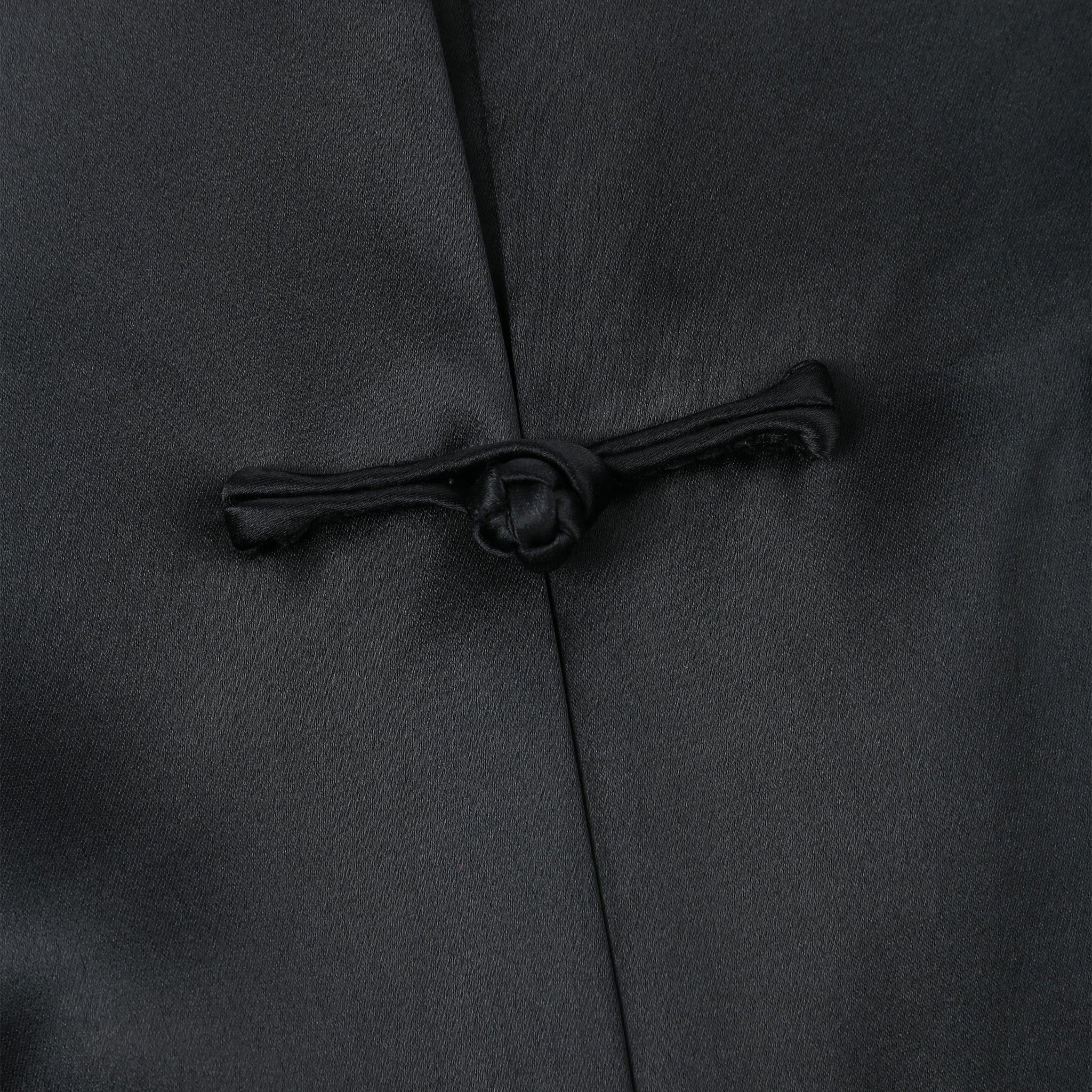 Black satin sleeveless longline vest with mandarin collar, classic hand-knot buttons and front vent, very waist-defining and is designed with a scall. Tailor-made by artisans in Wenzhou, China.
