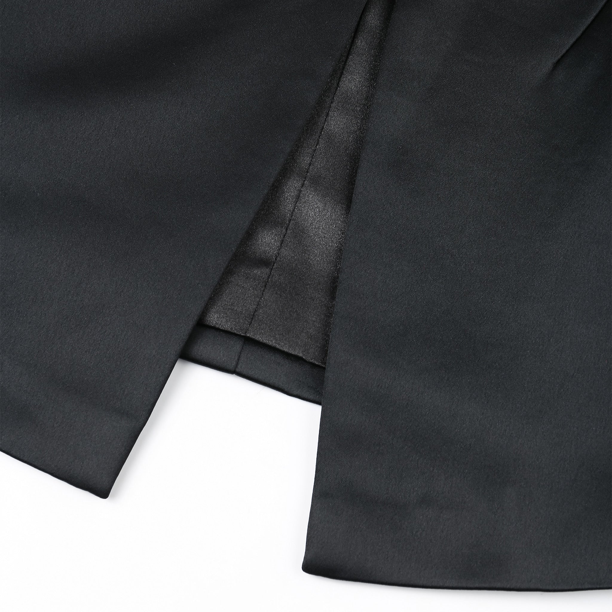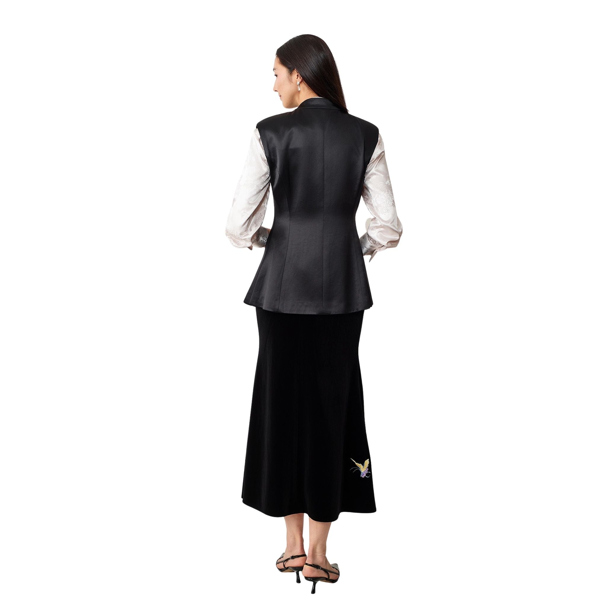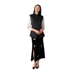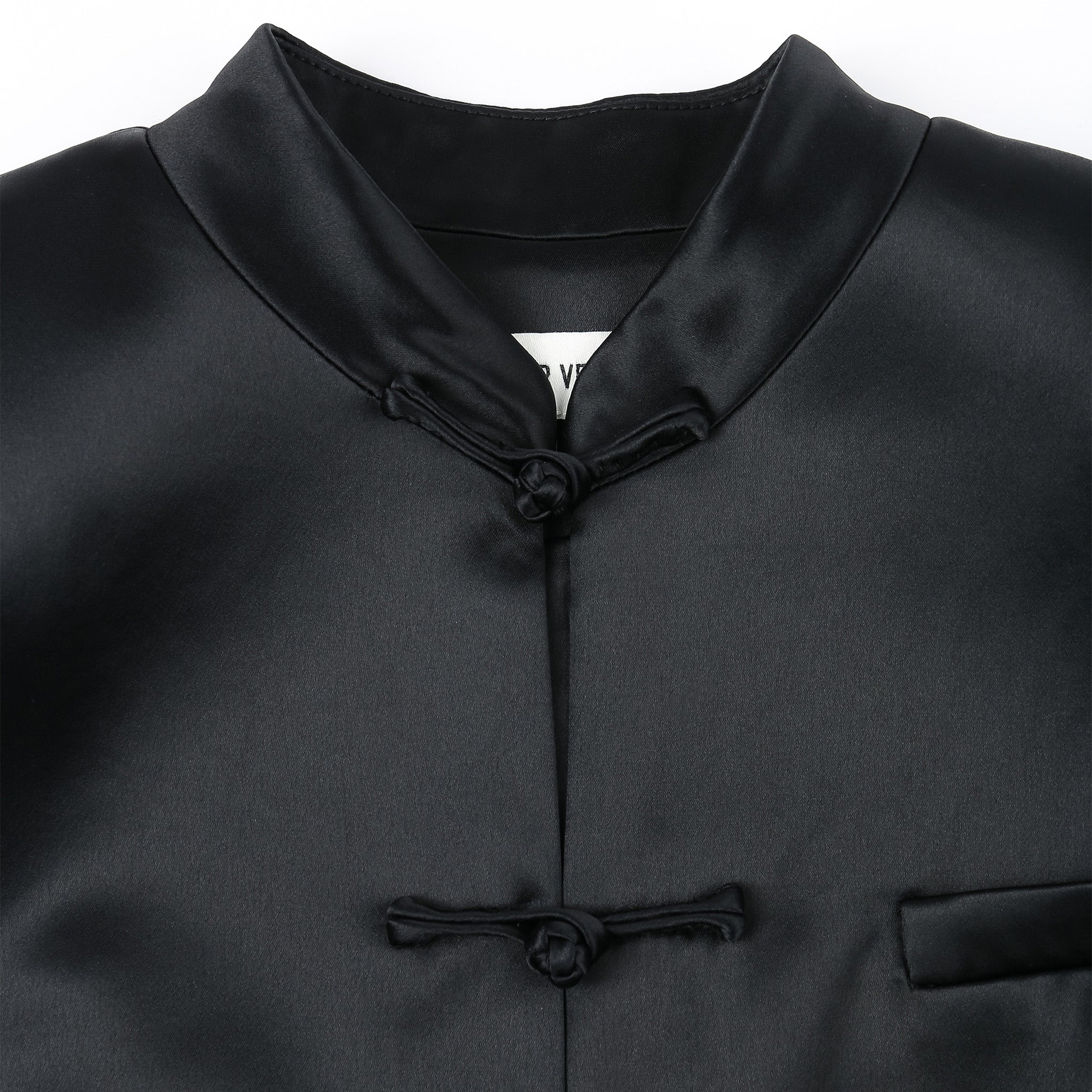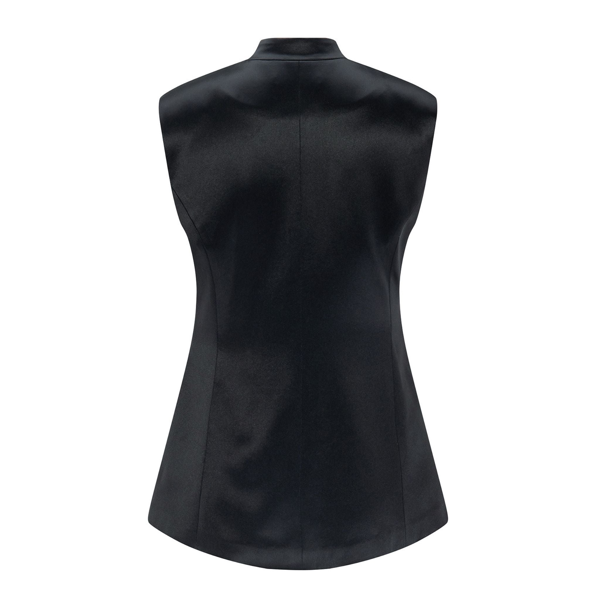 Black satin sleeveless longline vest with mandarin collar, classic hand-knot buttons and front vent, very waist-defining and is designed with a scall. Tailor-made by artisans in Wenzhou, China.
