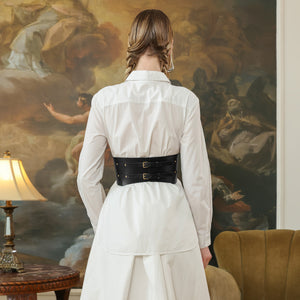 Crafted from smooth black leather, the Thane Leather Corset Belt features a sculpted silhouette that cinches the waist while adding a bold architectural edge. Its wide, contoured shape is designed to trace the natural curves of the waist, creating a striking yet harmonious fit. The double-buckle fastening at the back ensures an adjustable, secure hold.