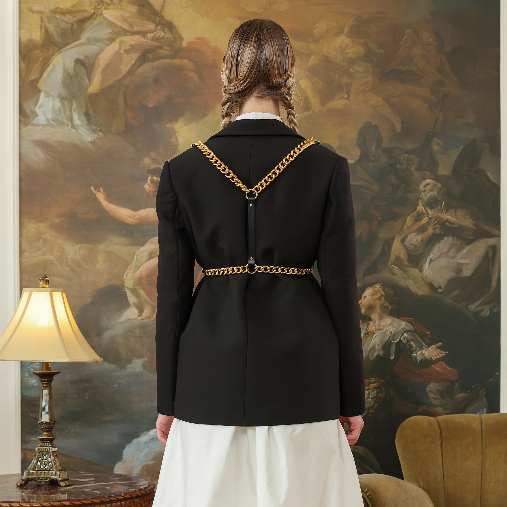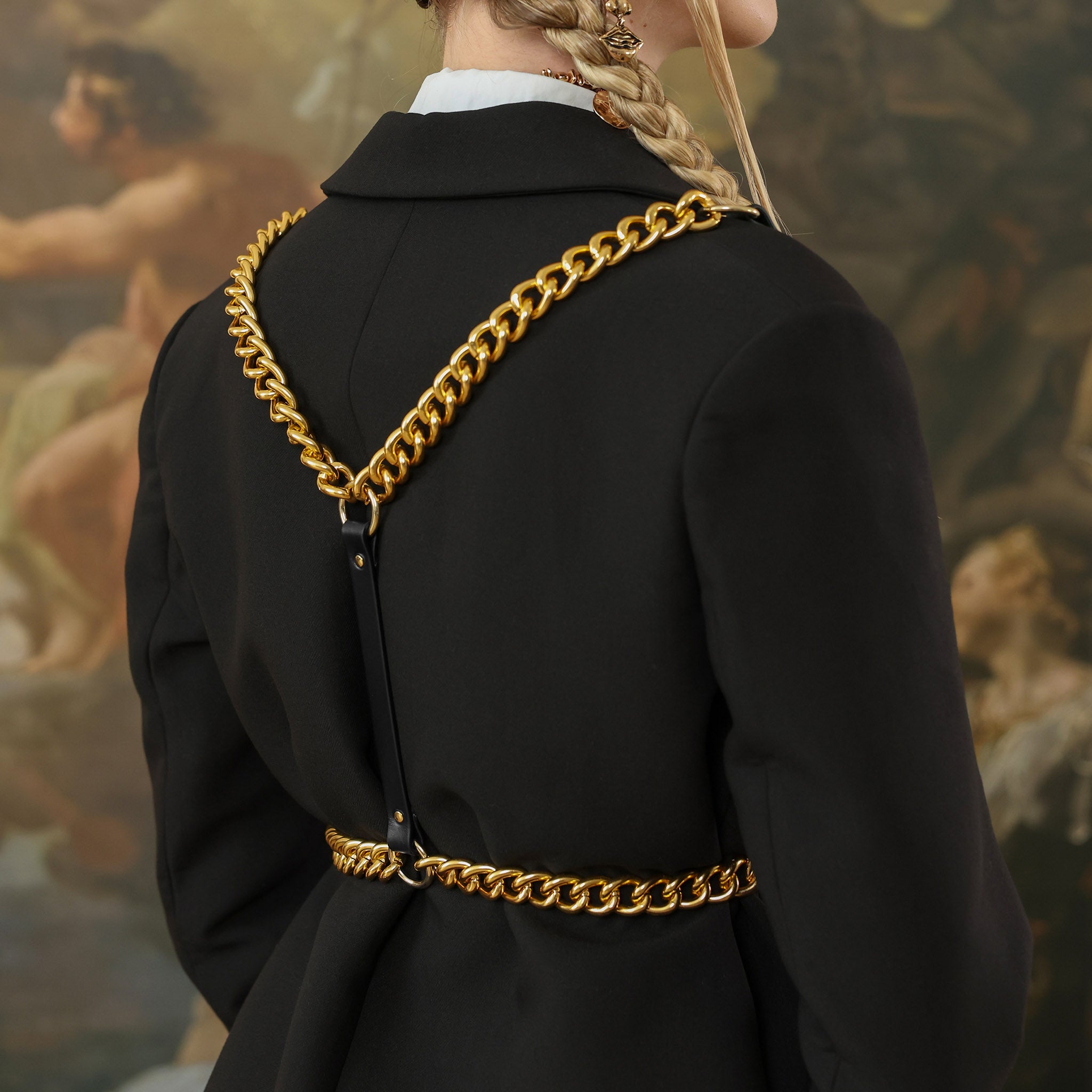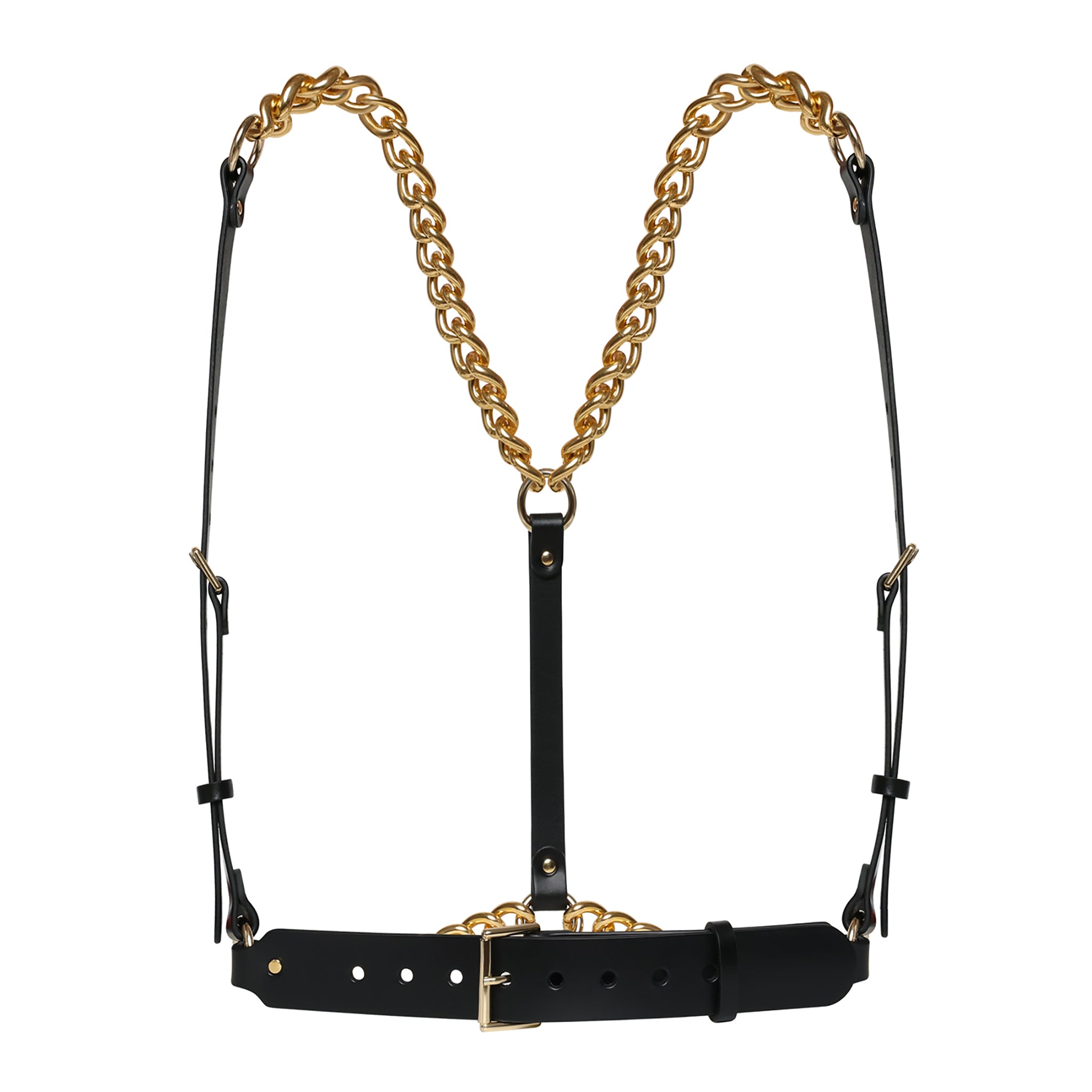 The Vea Chained Suspender Harness blends polished structure with statement detail, combining sleek black leather straps with bold gold chains draped across the back and waist. Designed to frame the torso and cinch the waist, it introduces a striking layered dimension to any outfit.
