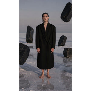 This floor-length blazer coat is a dramatic fusion of sharp tailoring and avant-garde outerwear. Crafted from premium structured suiting fabric, it features an elongated, floor-grazing silhouette that creates a powerful, statuesque aesthetic. The design is defined by its clean, minimalist lines—eschewing traditional buttons for a seamless, open-front drape that emphasizes its architectural volume and impeccable cut. Attention to detail is evident in the functional elements that enhance its movement and sophistication. The piece features a deep center-back vent that ensures fluid movement despite its length, complemented by refined vented cuffs without buttons for a modern, streamlined finish. With sharp notched lapels and structured shoulders, this blazer coat serves as the ultimate statement piece for a high-fashion, contemporary wardrobe.