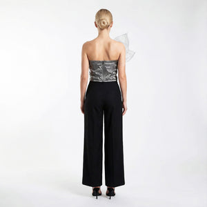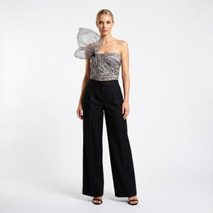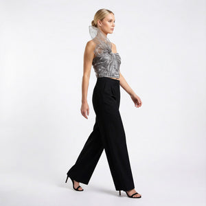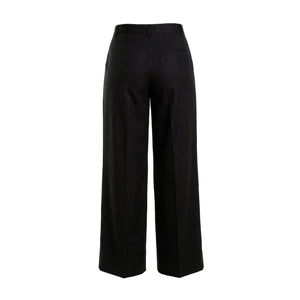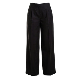 A cornerstone of the modern wardrobe, these wide-leg trousers embody effortless sophistication and impeccable tailoring. Crafted from a structured, mid-weight fabric, they feature a high-rise waist and a relaxed, fluid silhouette that creates an elongated, statuesque profile. The front is detailed with elegant pleats and sharp pressed creases, adding a touch of traditional menswear-inspired refinement to a contemporary feminine staple. The design is focused on clean lines and functional elegance. A streamlined waistband with discreet belt loops leads to a concealed front fastening for a seamless finish. Practicality meets style with subtle side-seam pockets and a single welt pocket at the back, maintaining a minimalist aesthetic. Whether for the boardroom or a gallery opening, these trousers offer a polished look that moves beautifully with every step.