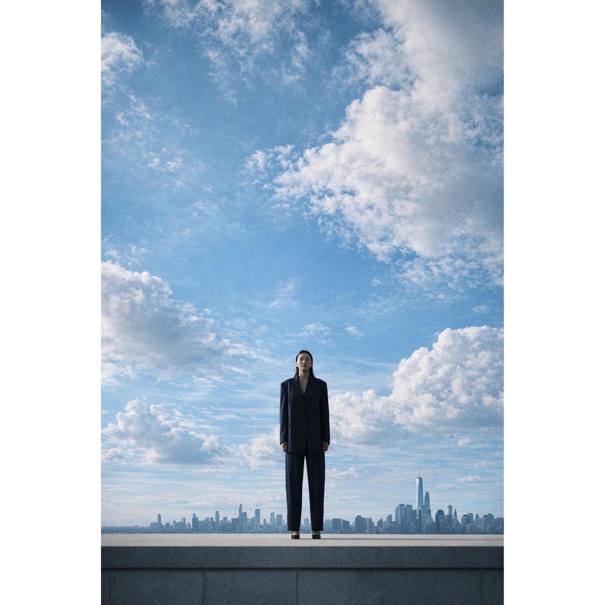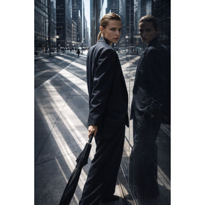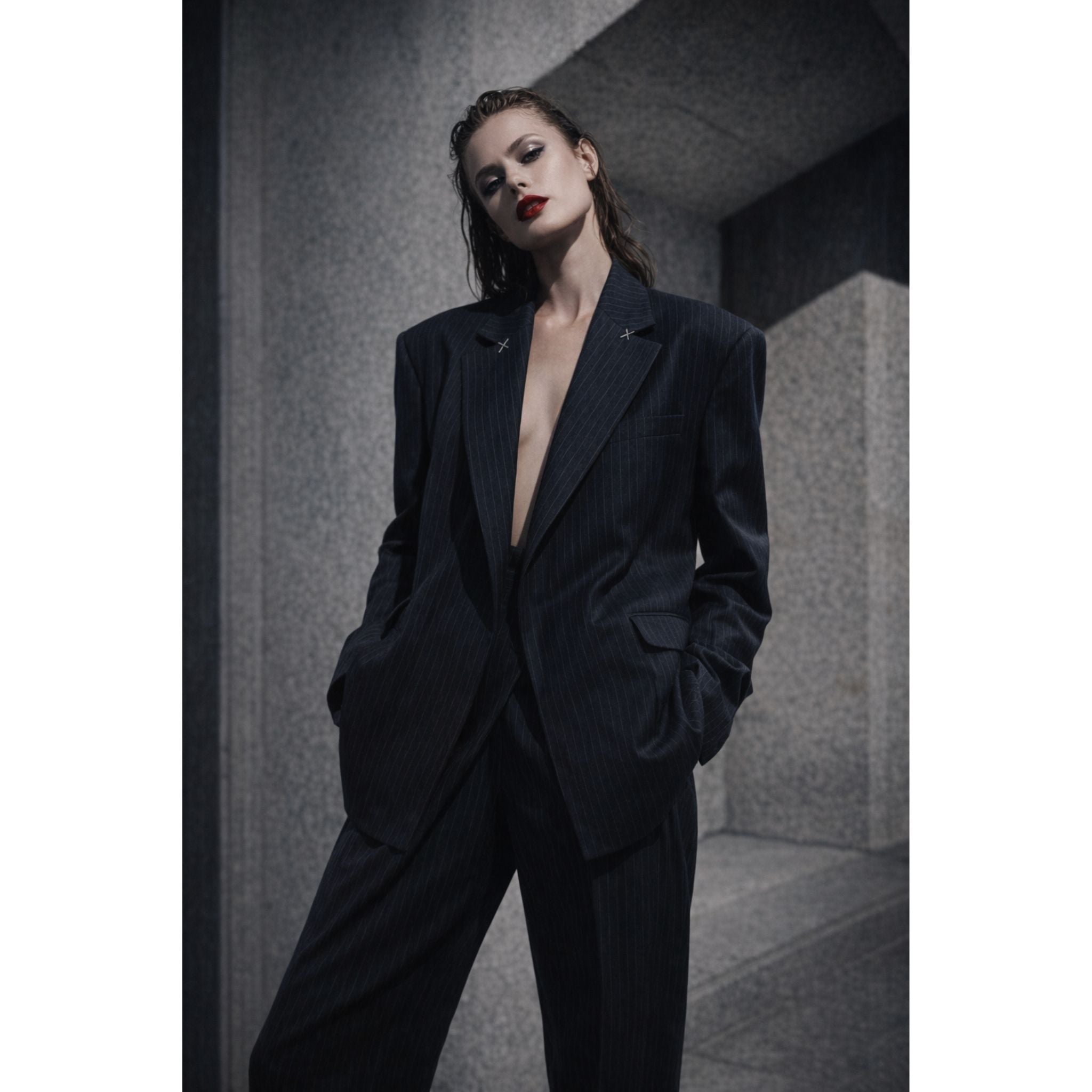 This oversized unisex blazer is a masterclass in relaxed tailoring and contemporary minimalism. Featuring a classic pinstripe pattern on a deep navy base, it redefines the power suit with its buttonless, open-front design, allowing for a fluid, effortless drape. The architectural silhouette is emphasized by exaggerated shoulders and a voluminous cut, making it a versatile statement piece for any gender.