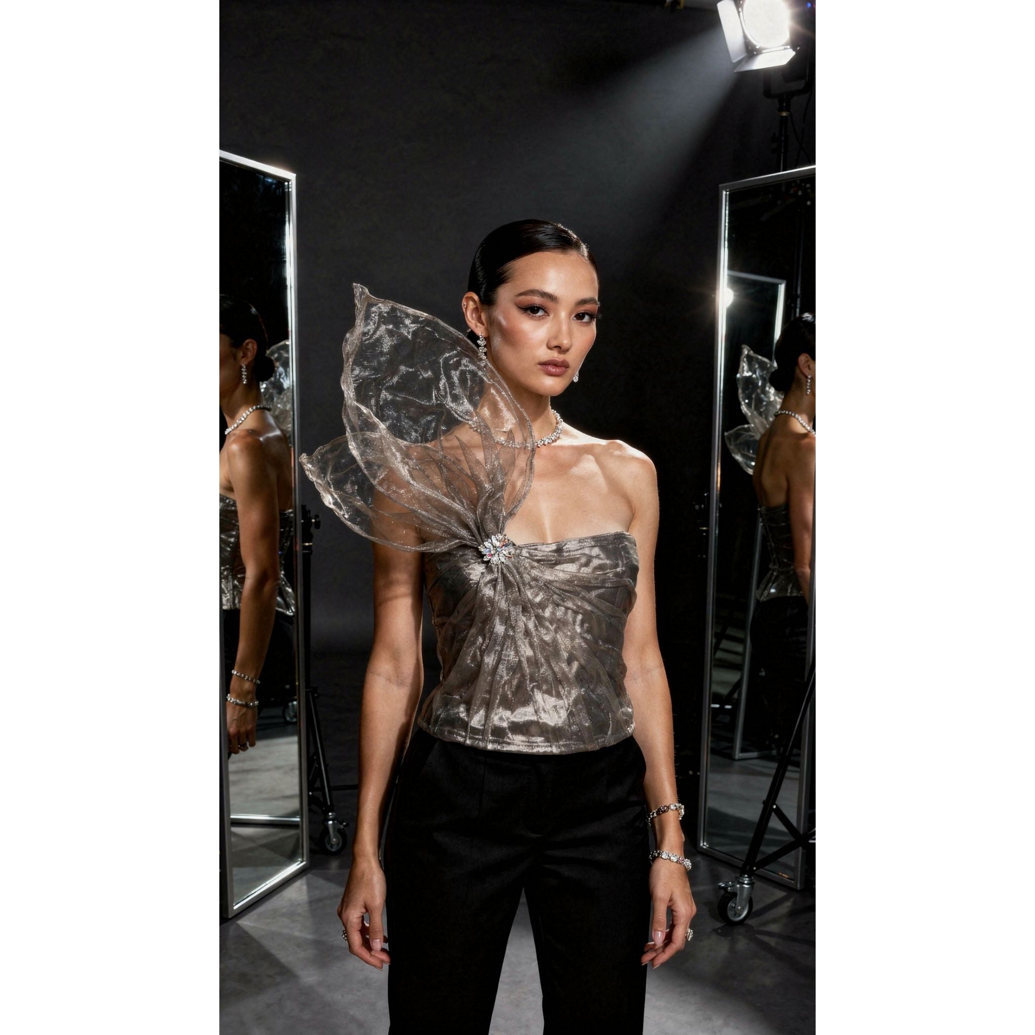 An avant-garde sculptural piece that transforms industrial materials into high-fashion artistry. This corset is meticulously crafted from metallic construction mesh, giving the garment a unique, structured rigidity and a futuristic silver sheen. To ensure maximum comfort against the skin, the interior is fully lined with soft, breathable cotton, blending raw edge aesthetics with refined wearability. The silhouette is defined by a dramatic, organic wing-like structure that rises from the bust, held in place by a crystal-embellished ring that adds a touch of high-octane glamour. The body of the corset features a naturally crinkled, multidimensional texture, while a functional exposed metal zipper at the center back seam grounds the ethereal design with a clean, industrial finish.