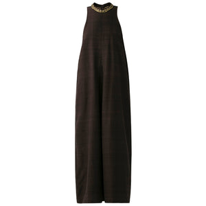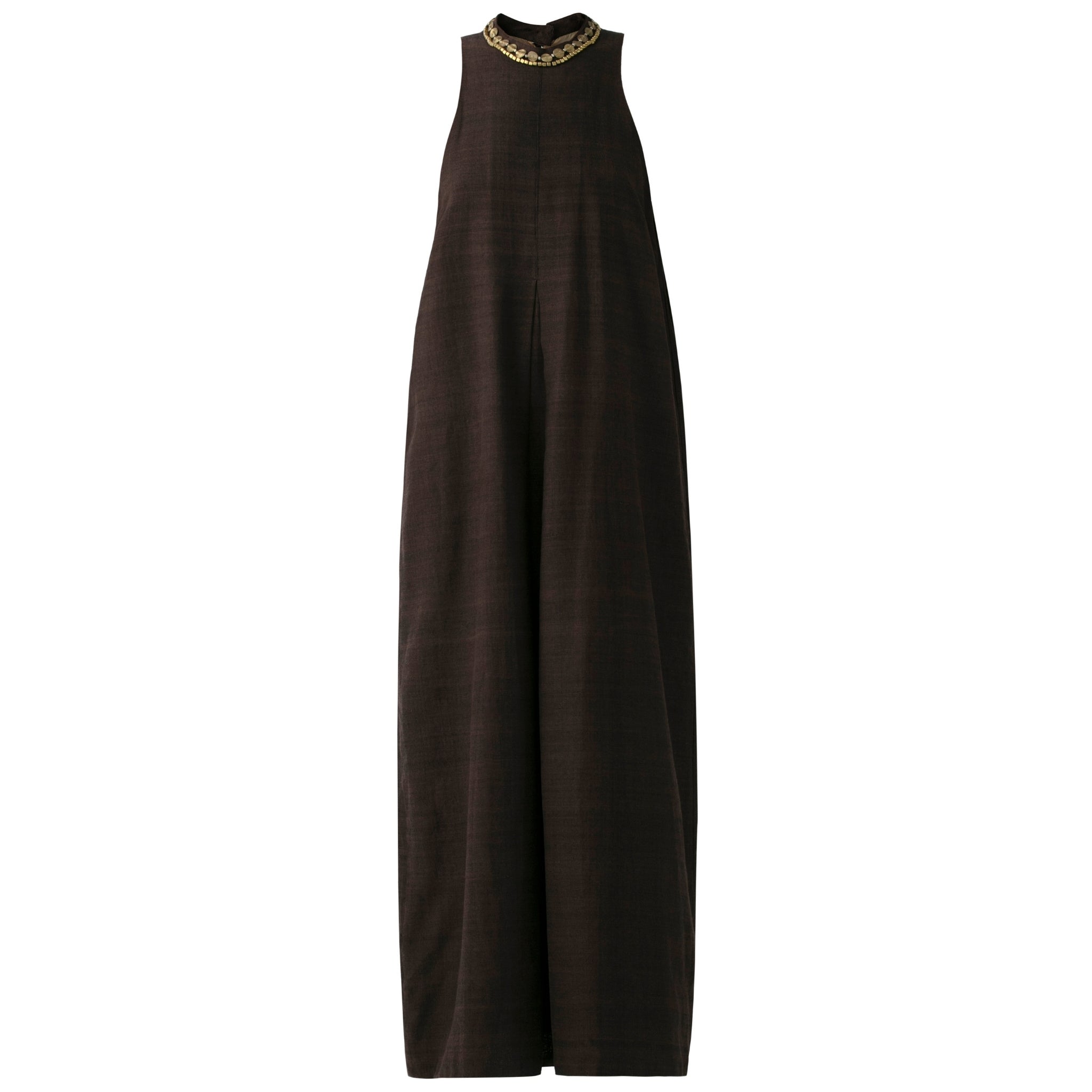 Rooted in ritual and refined in silhouette, the Kotpad Cocoa Dress is a quiet statement in mindful luxury. Crafted from breathable, naturally dyed Kotpad cotton in a rich chocolate brown hue, this full-length halter dress features an elegant high neckline adorned with hand-cast dhokra beads — a tribute to India’s enduring tribal metalwork traditions.