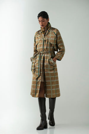 BOITO - Gold Chequered Ikat Silk Trench Coat | at DOORS NYC