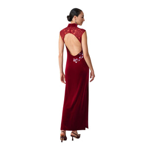 Cut from plush burgundy velvet, this floor-length qipao is tailored to skim the body with a clean, elongated line and a side slit for ease. A sheer lace yoke and cap sleeves add lightness at the shoulders. Wisteria-inspired embroidery in lilac and ivory traces the front like a floral garland, while the back reveals a dramatic oval cut-out bordered by lace and finished with a row of covered buttons for a refined, vintage-meets-modern finish.