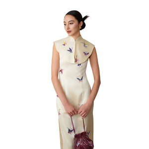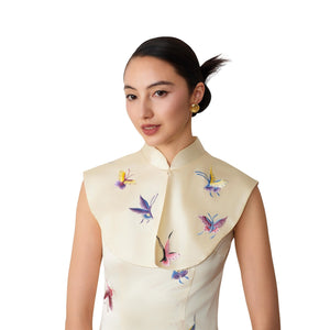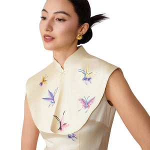 Sholder adornment made in soft cream silk. Colourful butterfly motifs are embroidered across the front and the back with mulberry-silk thread in a hand-embroidered effect. Tailor-made by artisans in Wenzhou, China.