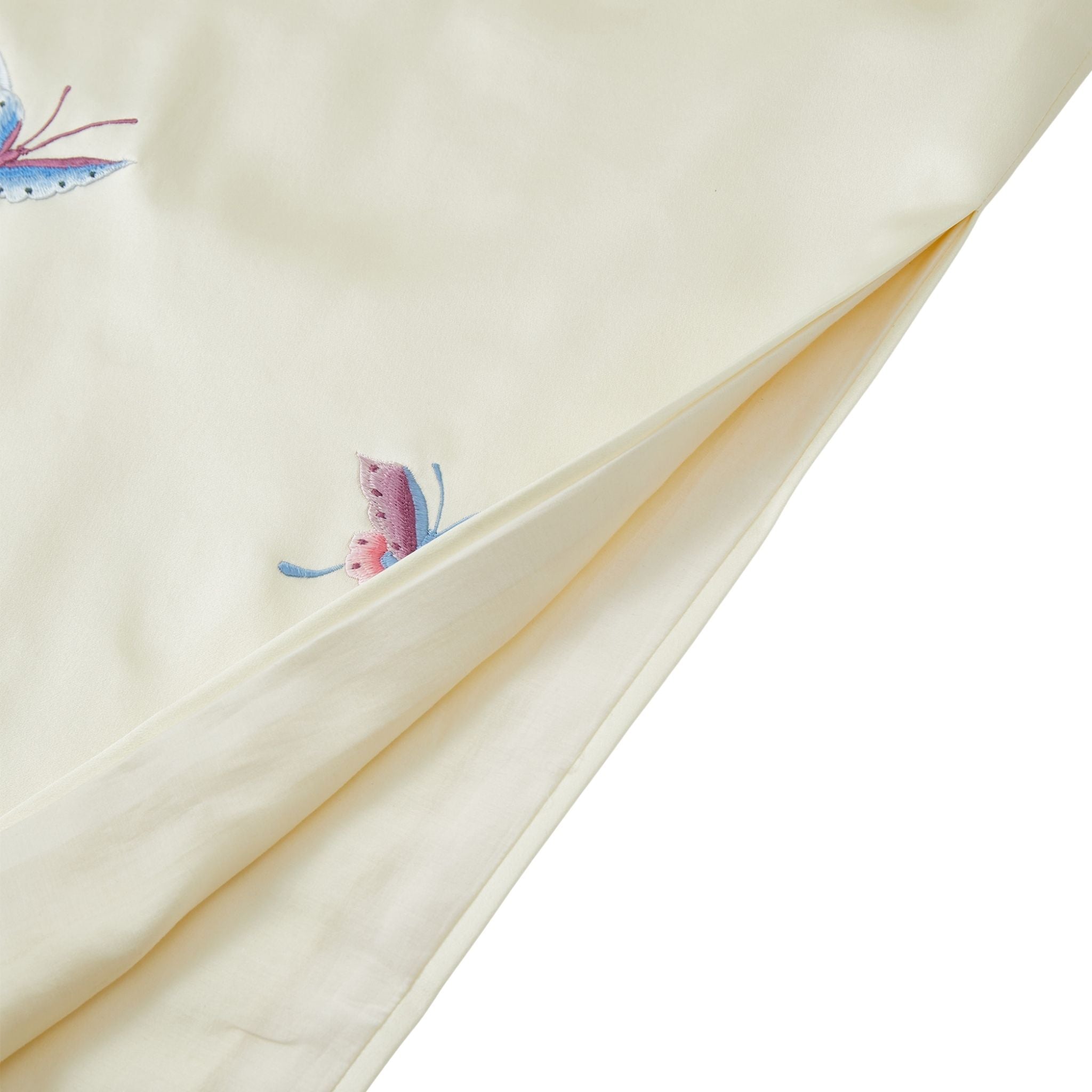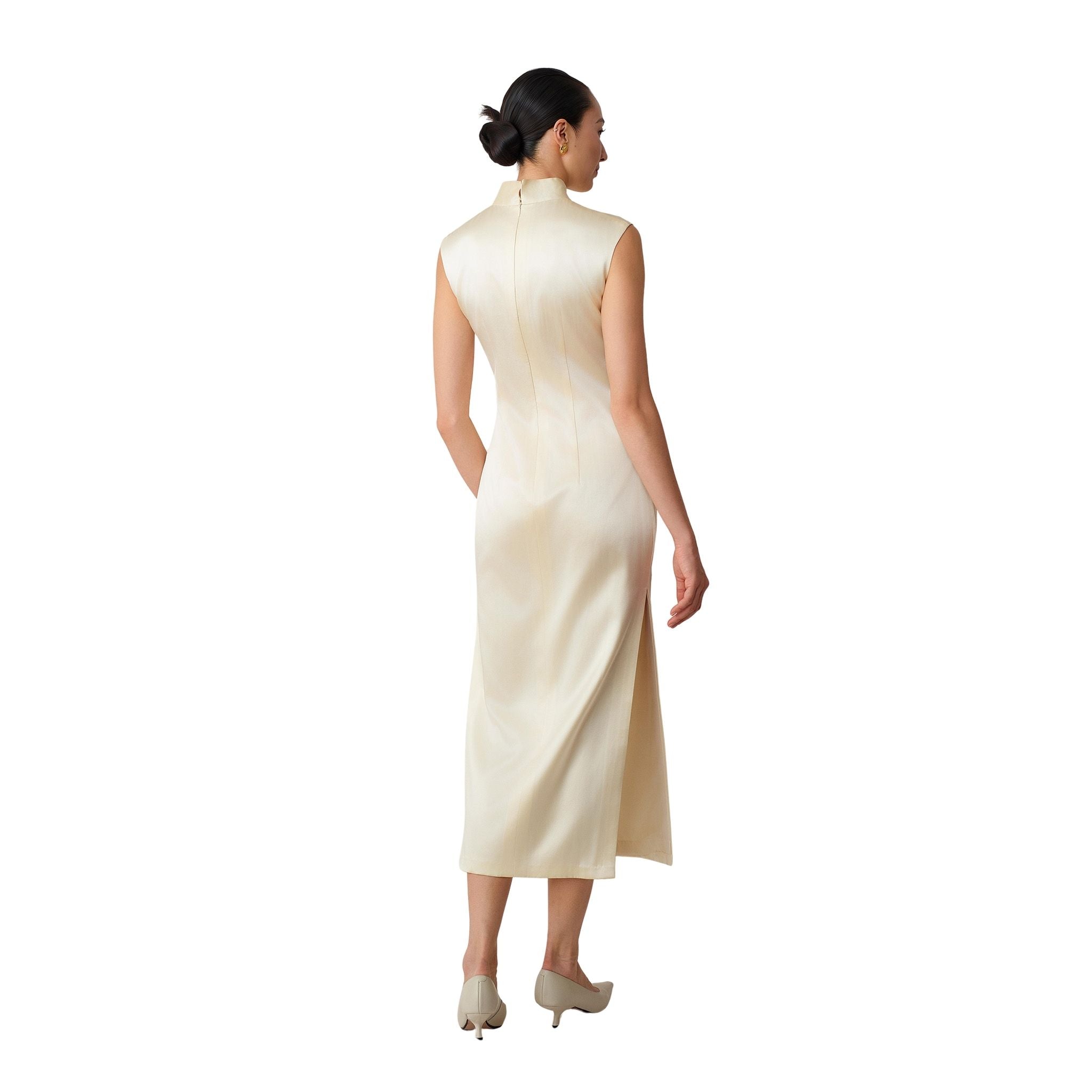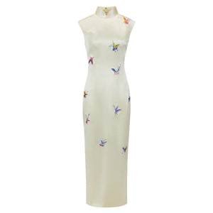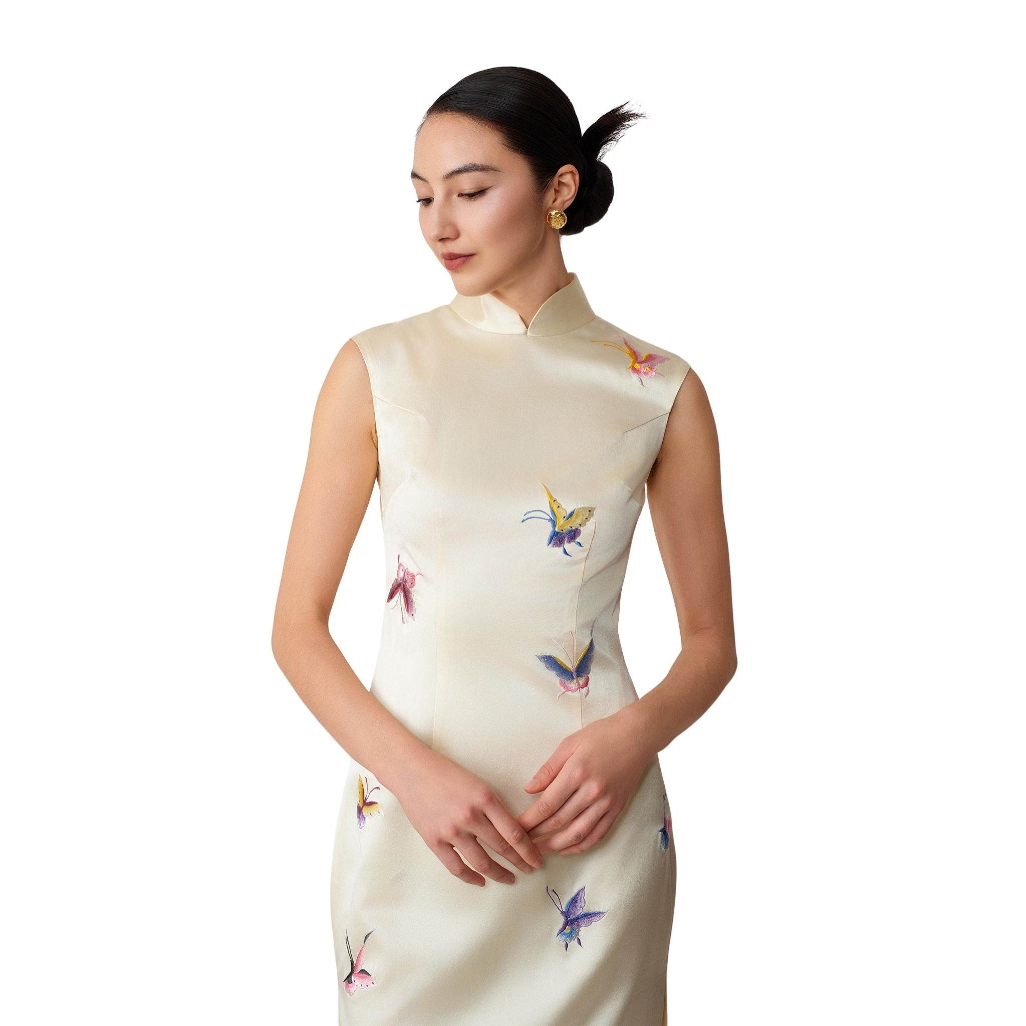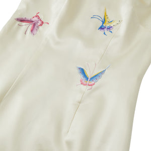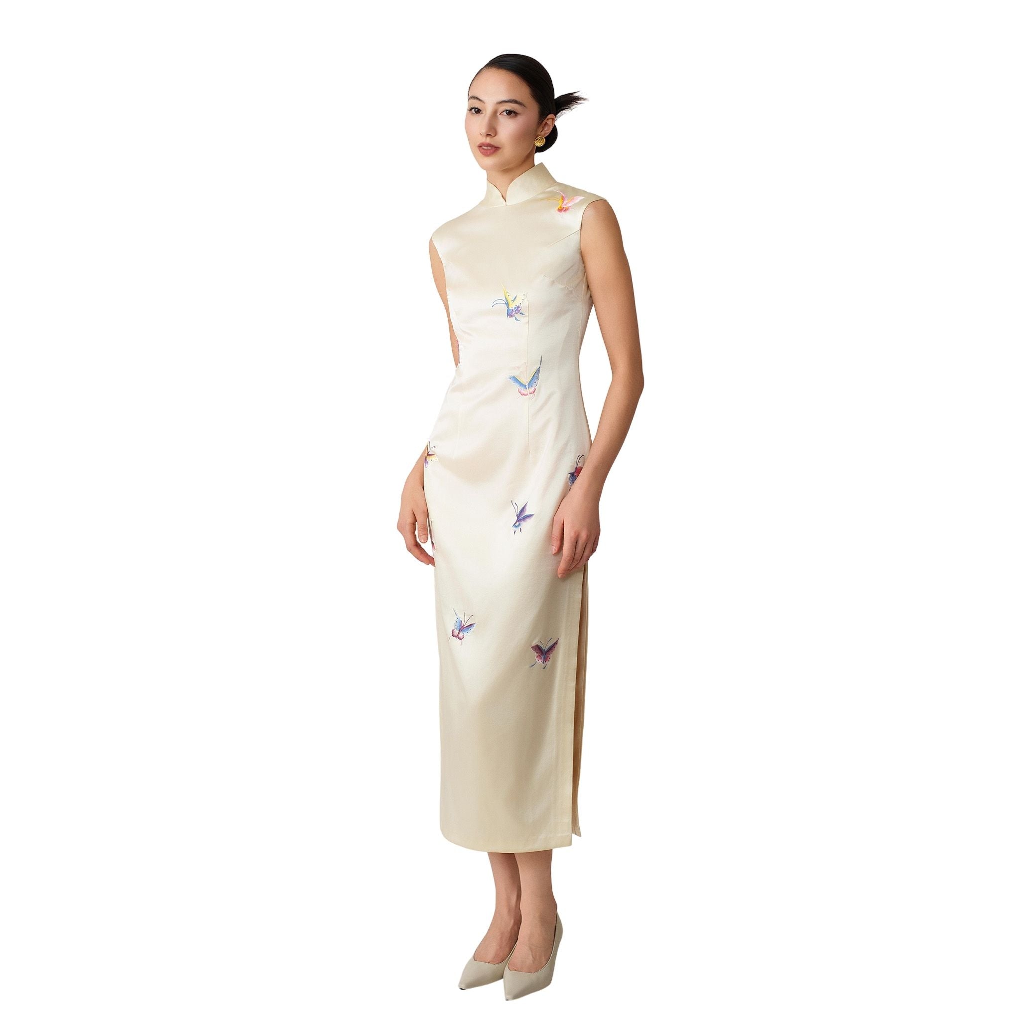 A full-length qipao in soft cream silk with a gentle lustre, tailored to a sleek, classic qipao silhouette. Sculptural shell cap sleeves create a clean, modern frame, while colourful butterfly motifs are embroidered across the front with mulberry-silk thread in a hand-embroidered effect. The back is kept minimalist with a concealed zip, letting the butterfilies take focus, bring love and good fortune.